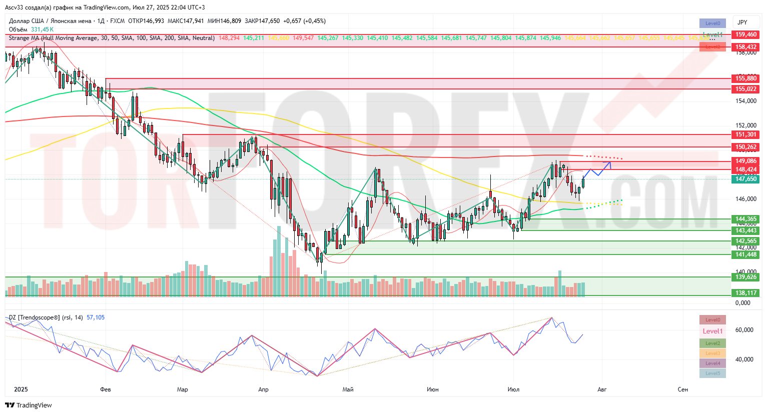 - Зона 147.00-147.50: Ближайшая динамическая поддержка, а также предыдущие локальные максимумы.