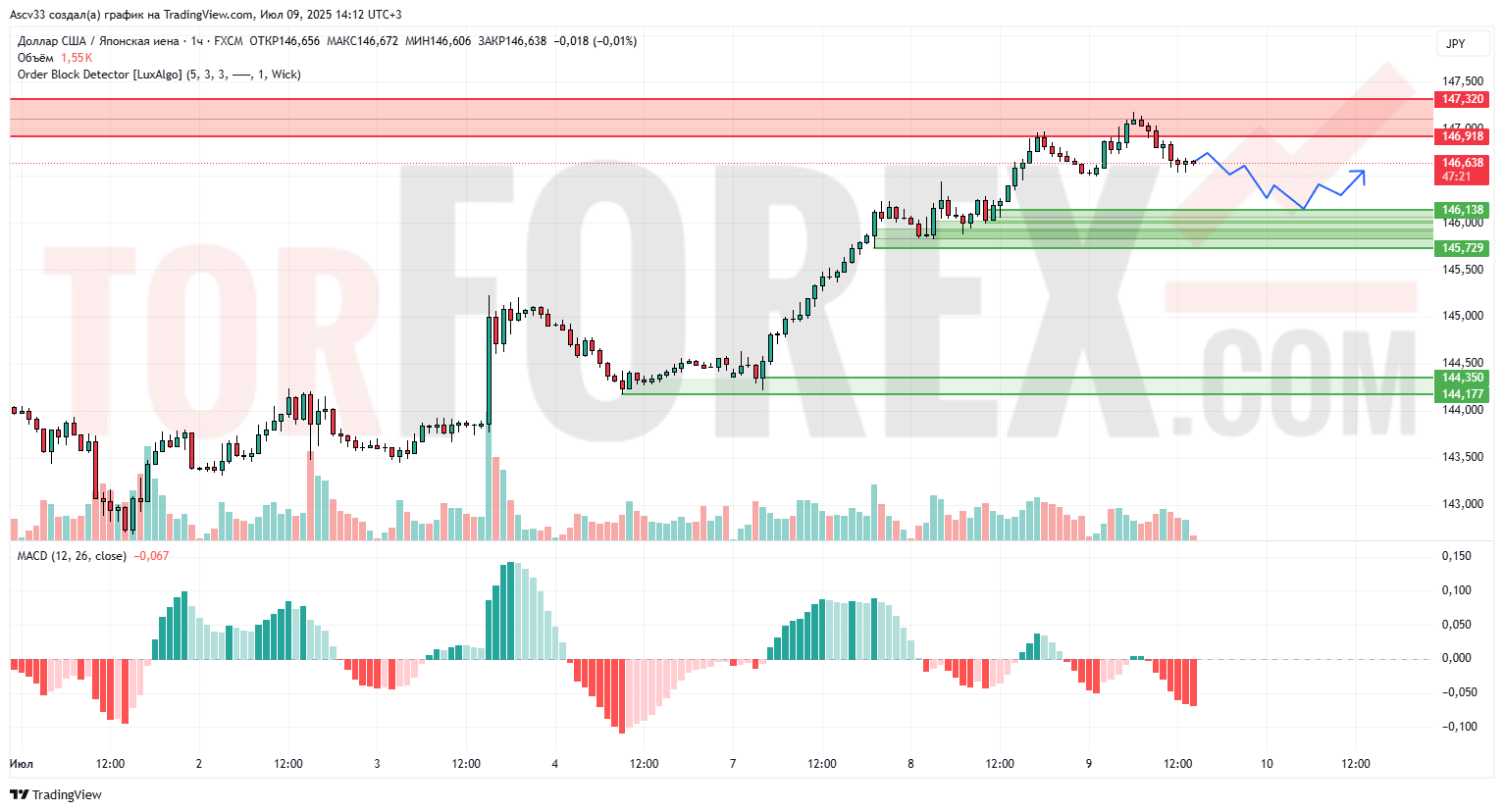 USD/JPY демонстрирует признаки коррекции после касания зоны предложения 146.91–147.32. Рост, сформированный на предыдущих сессиях, замедлился, и цена начала откатываться от локального максимума. Продавцы активизировались вблизи сопротивления, а быки перешли в фазу фиксации прибыли. Поддержка располагается ниже на уровнях, где ранее происходила консолидация.