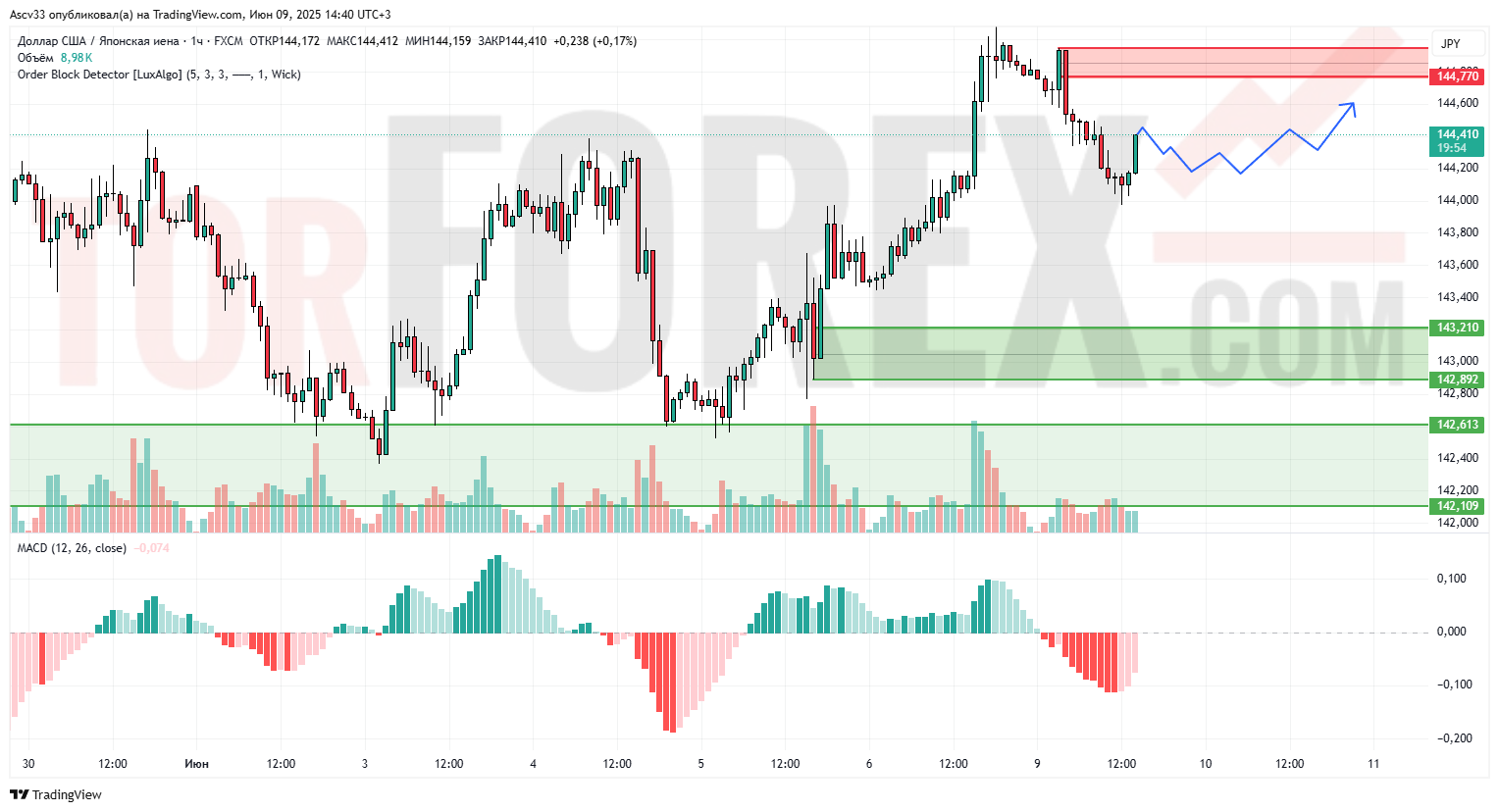 Ближайшие часы возможна консолидация между 144,00 и 144,77. Пробой вверх откроет путь к 145,10 и выше. Альтернативный сценарий — повторный откат к 143,80–143,20 с последующим ростом.