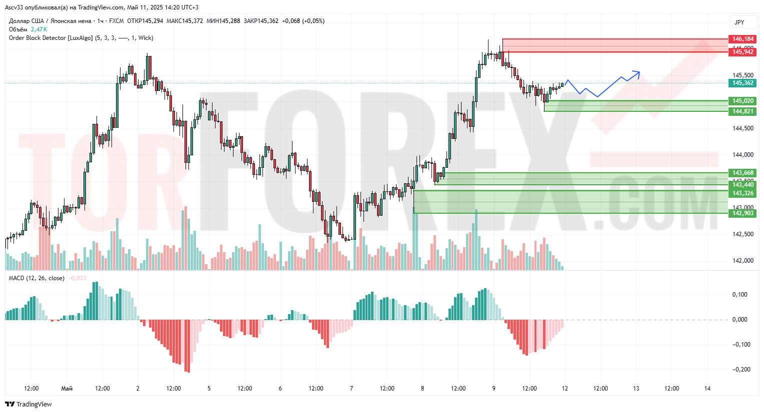 Пара USD/JPY корректируется вверх после краткосрочного снижения, удерживаясь над зоной поддержки 145,00–145,02. Импульс восходящего движения постепенно восстанавливается, что подтверждается стабилизацией объемов и формированием локального минимума. MACD демонстрирует разворот вверх, усиливая сигнал на продолжение роста.