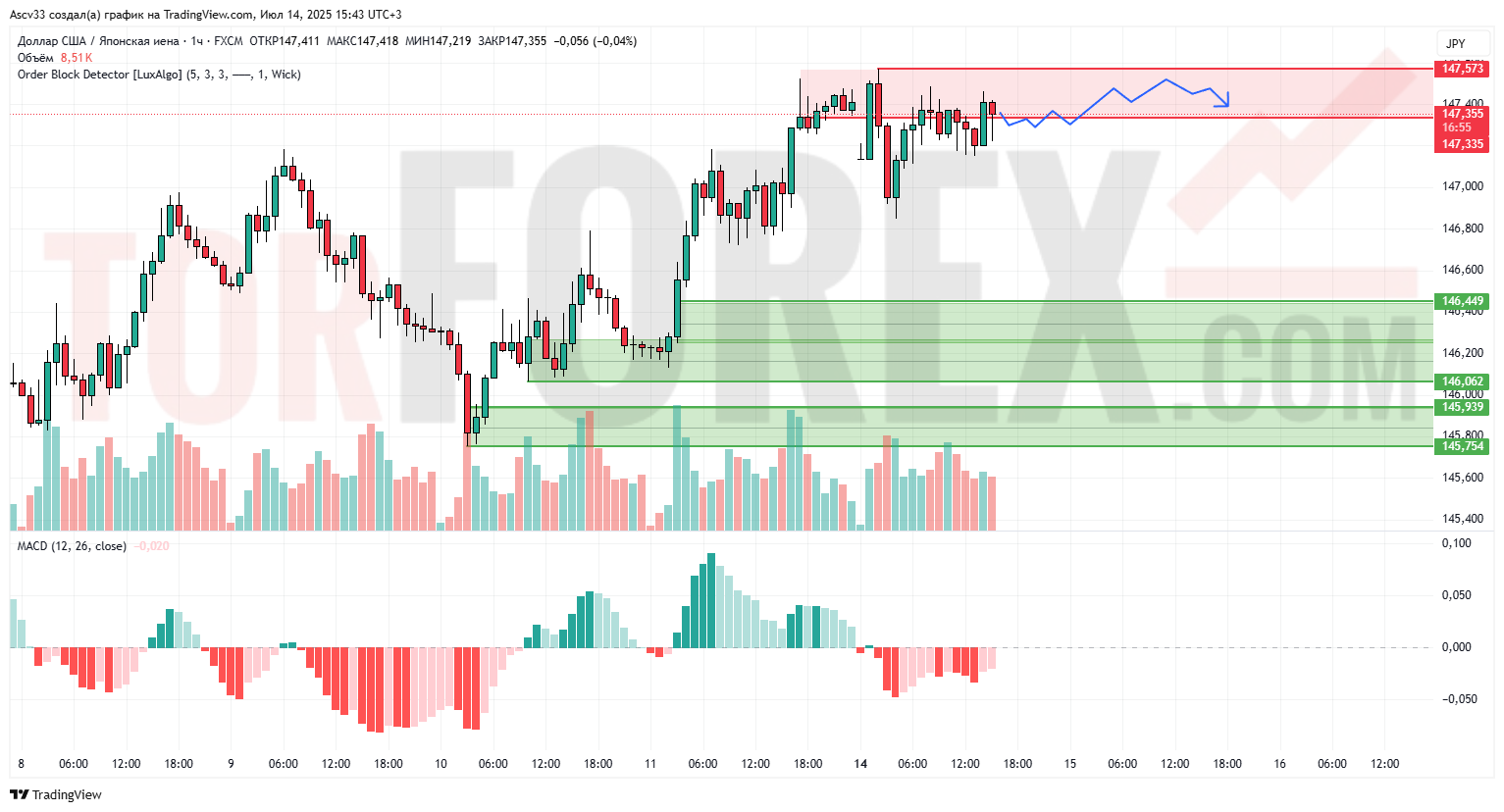 147,33–147,57 — плотная зона предложения, где ранее фиксировались крупные объёмы. Является важным уровнем, ограничивающим рост пары.