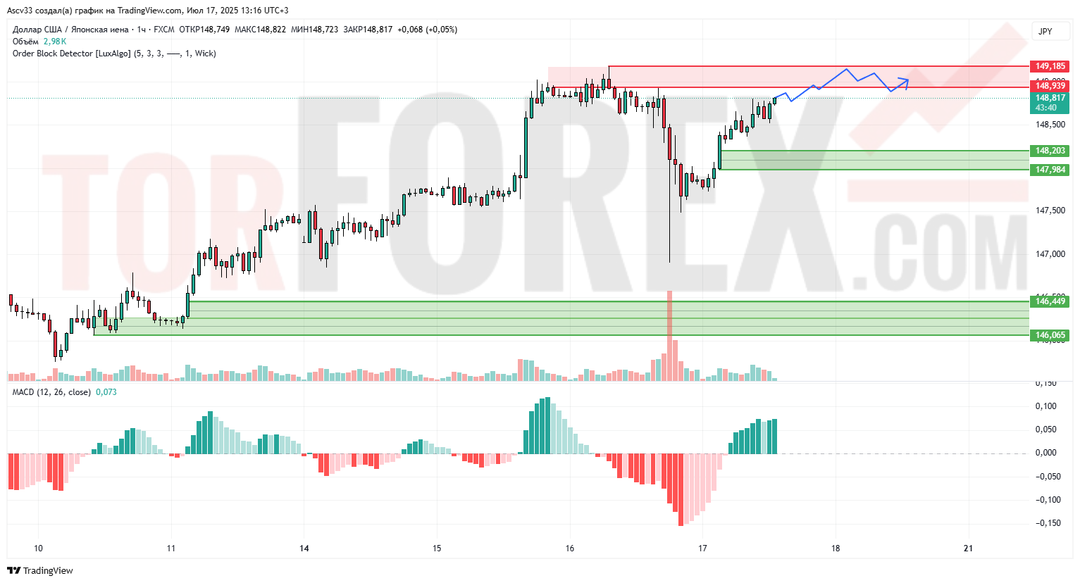 Выше располагается потенциальная цель в районе 149.50, если цена пробьёт текущую зону.