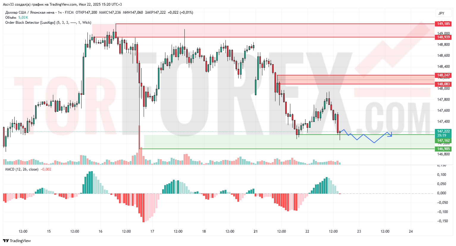 147.16–146.90 — ближайшая зона спроса, где уже наблюдается замедление падения. При пробое вниз следующая поддержка — 146.45–146.24.