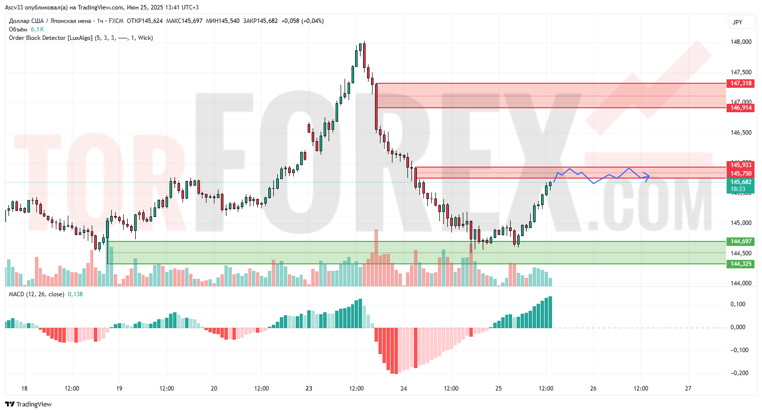 144,70–144,32 — свежая зона спроса, из которой началось текущее восходящее движение. Потенциальный ориентир для коррекции.