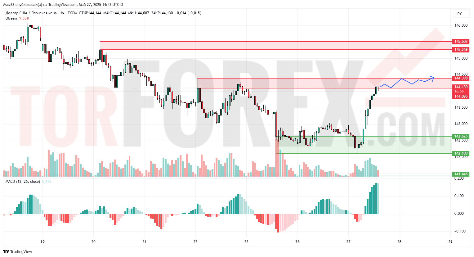 Ожидается консолидация в диапазоне 144,00–144,50. При устойчивом пробое выше 144,50 пара может направиться к 145,30. В случае отката ключевой поддержкой выступит уровень 144,00. Структура указывает на приоритет сохранения восходящего тренда после краткой фазы накопления.
