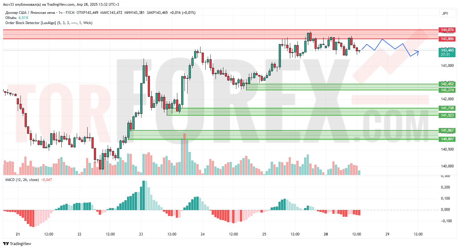 Ожидается продолжение бокового движения между 143,00–143,80. В случае пробоя вниз актуально снижение в район 142,45.