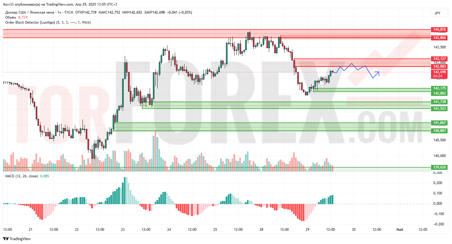 Ожидается движение в диапазоне 142.06–143.13. При пробое сопротивления 143.13 возможен тест зоны 143.80–144.00. Отбой от сопротивления может вернуть цену к 142.17.