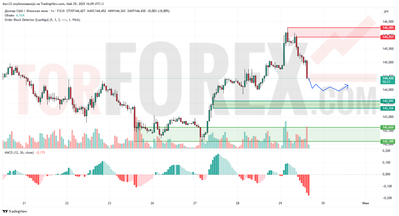 Пара USD/JPY резко откатилась от зоны предложения 145,90–146,28 после неудачной попытки закрепления выше. Движение вниз сопровождалось всплеском объёмов и уверенным разворотом MACD в отрицательную зону — признаки активизации продавцов. Сейчас цена приближается к важной области поддержки 144,00–143,60, где ранее наблюдался интерес покупателей.