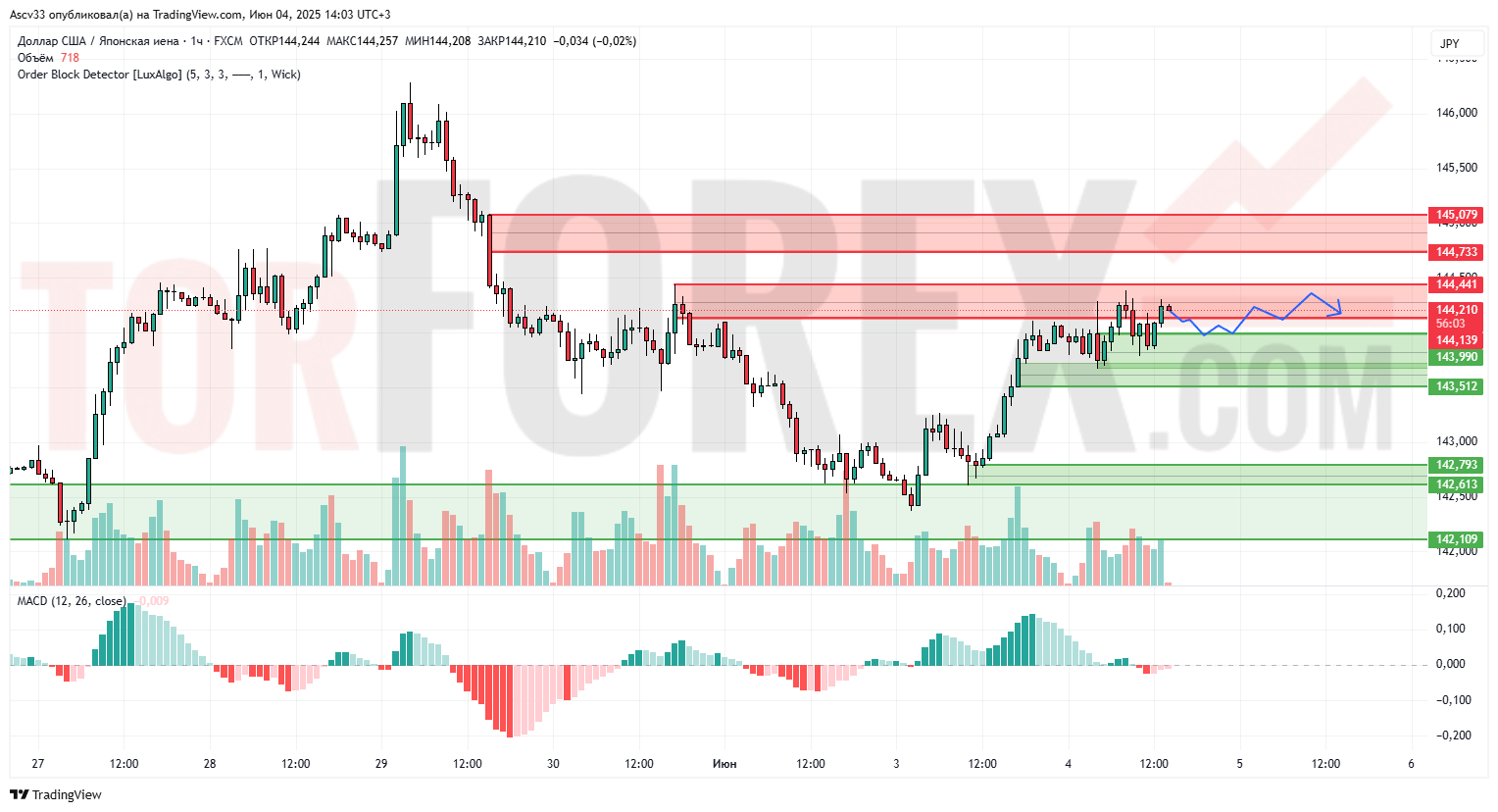 Пара USD/JPY торгуется в узком диапазоне под ключевым сопротивлением 144.44. После отскока от зоны 142.60–142.79 цена восстановилась, но дальнейшее движение вверх затруднено зоной продавцов. MACD сигнализирует о замедлении восходящего импульса, объёмы снижаются.