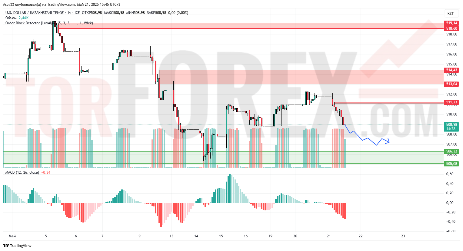 Пара USD/KZT продолжает снижение после отката от зоны предложения 513,00–514,50. Текущее движение сопровождается уверенным давлением продавцов. Цена пробила уровень 511,00 и закрепилась ниже, при этом MACD демонстрирует усиление негативной гистограммы. Объёмы остаются стабильными, что говорит о поддержке текущего нисходящего импульса.