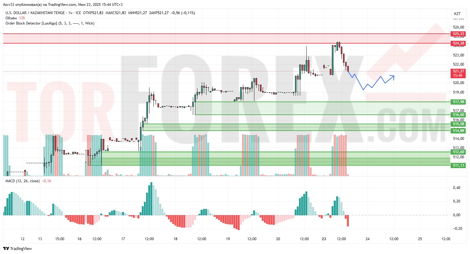 USD/KZT демонстрирует коррекционное движение после достижения локального максимума в районе 524,28–525,33. Цена пробила предыдущую зону консолидации и на фоне сниженного объема начала откат. Индикатор MACD указывает на убывающий бычий импульс и возможное формирование медвежьей фазы на часовом таймфрейме.