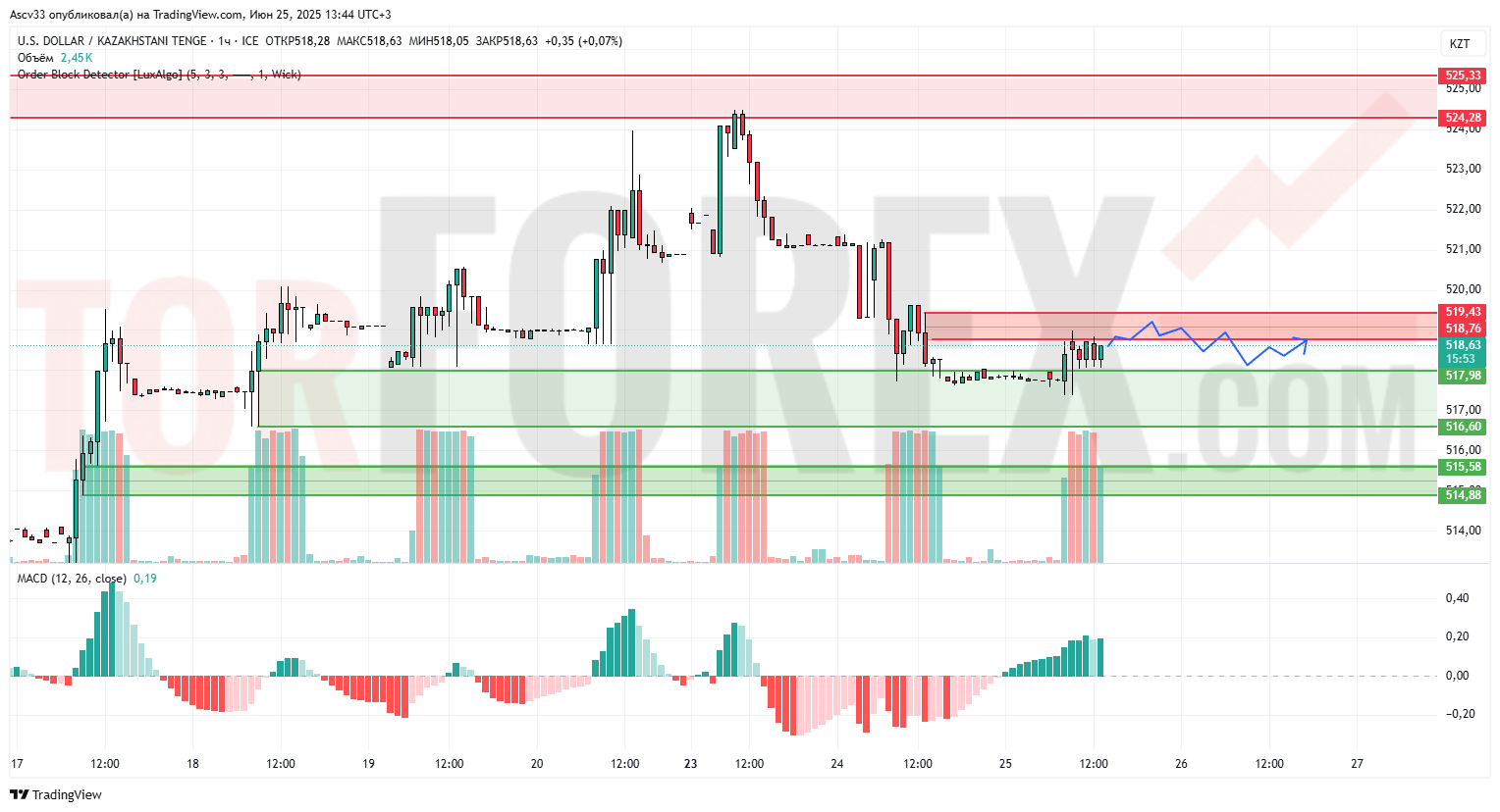 Пара USD/KZT показывает слабую активность после недавнего снижения. Цена стабилизировалась в узком диапазоне между зонами спроса и предложения. Наблюдается краткосрочное восстановление от поддержки на фоне низких объёмов, что указывает на слабость покупателей. Текущее движение формирует структуру консолидации под уровнем сопротивления 519,4.