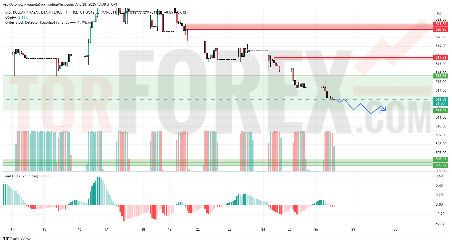 Пара USD/KZT сохраняет медвежью динамику, торгуясь вблизи нижней границы локальной зоны поддержки 511,82–513,03. Давление продавцов остаётся сильным, что видно по устойчивому снижению на фоне отрицательных показаний MACD. Однако снижение замедляется по мере приближения к поддержке, что может вызвать консолидацию.