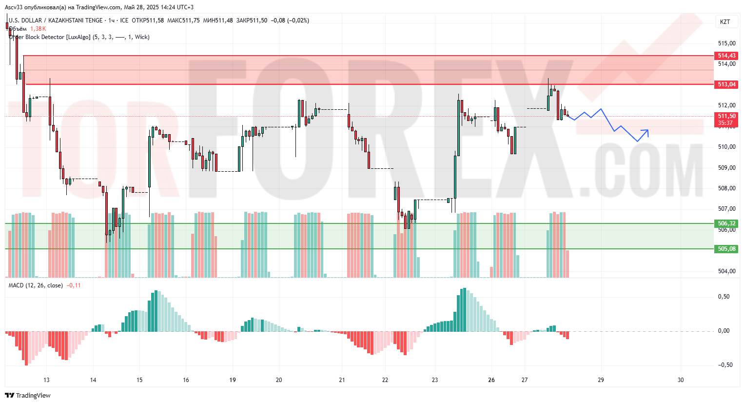 Пара USD/KZT вновь отбилась от зоны предложения в районе 513,00–514,40 и начала снижение. Текущее движение указывает на усталость покупателей и формирование локального отката. MACD перешёл в отрицательную зону, что подтверждает медвежий импульс. Объёмы остаются на среднем уровне — рынок в стадии коррекции после попытки роста.
