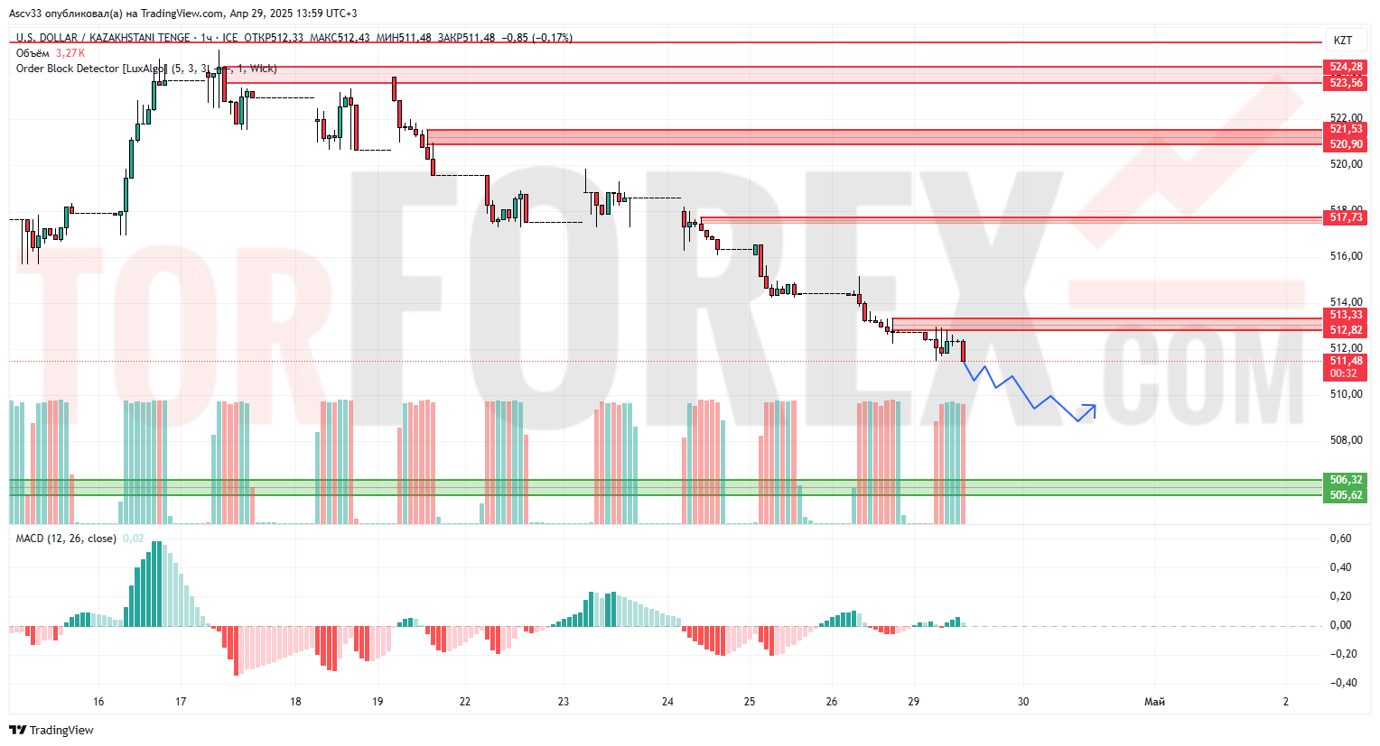 Пара USD/KZT продолжает нисходящий тренд, обновляя локальные минимумы. Цена закрепилась ниже ключевой зоны предложения 512.82–513.33, которая теперь выступает как сопротивление. Ближайшая цель движения — зона спроса в районе 505.62–506.32. Объёмы сохраняются на стабильном уровне, что подтверждает наличие продавцов. Индикатор MACD остаётся в отрицательной зоне, несмотря на попытку восстановления.