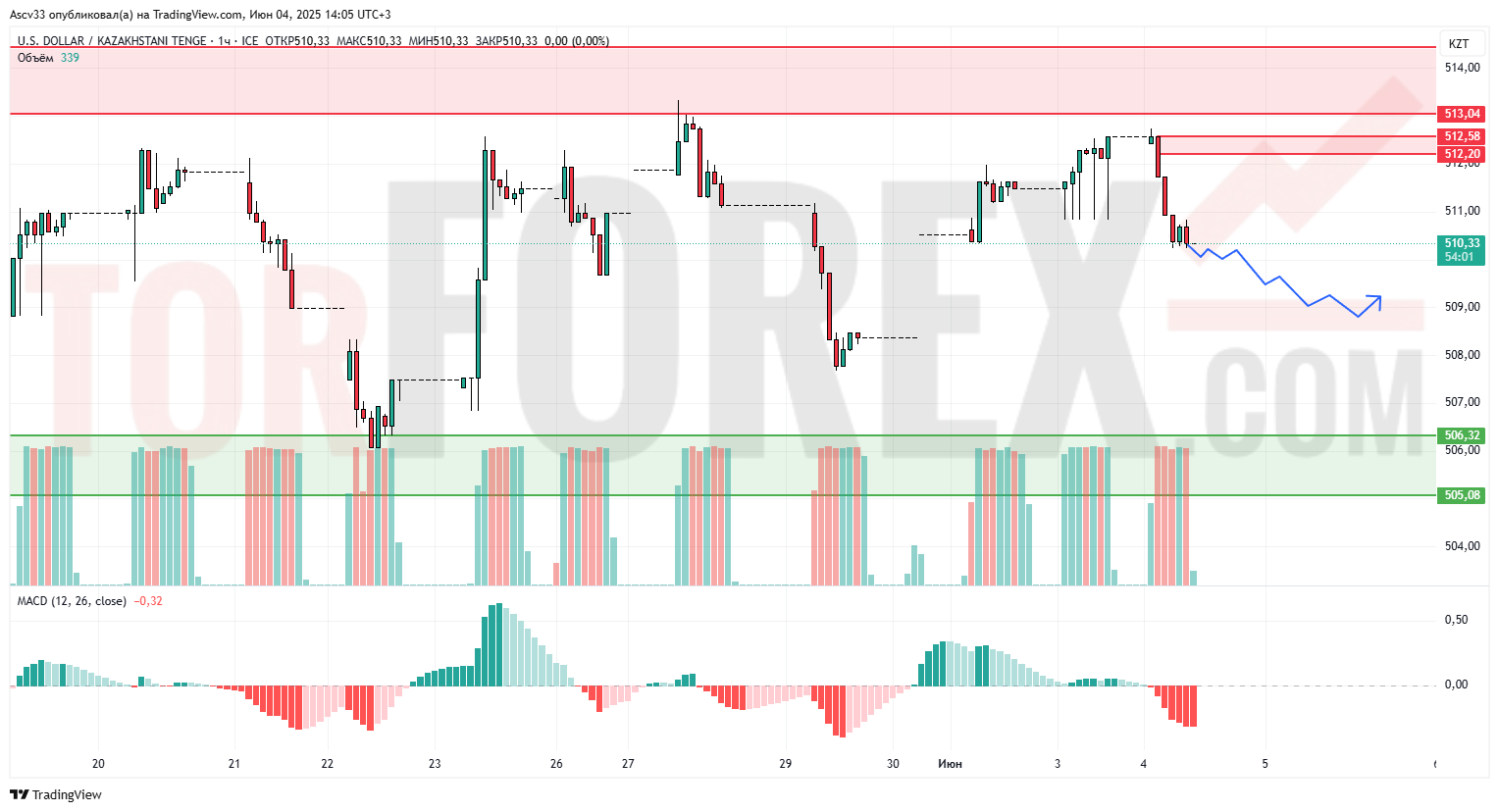 USD/KZT снова оттолкнулся от зоны сопротивления 512.20–513.04, подтверждая силу продавцов в этом диапазоне. Цена удерживается ниже сопротивления, формируя паттерн снижения. Объёмы умеренные, индикатор MACD перешёл в отрицательную зону, указывая на растущую медвежью динамику.