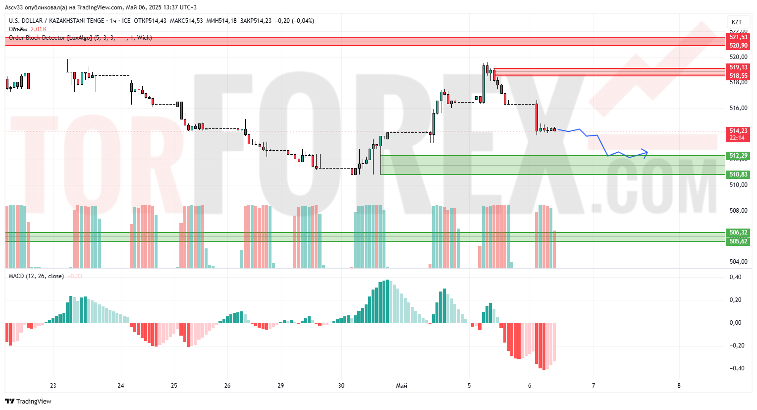 Ожидается движение в направлении зоны поддержки 510,8–512,3 с возможной попыткой стабилизации. При пробое вниз актуализируется цель в районе 505,6. Вероятность роста ограничена, пока цена не преодолеет 518,5.