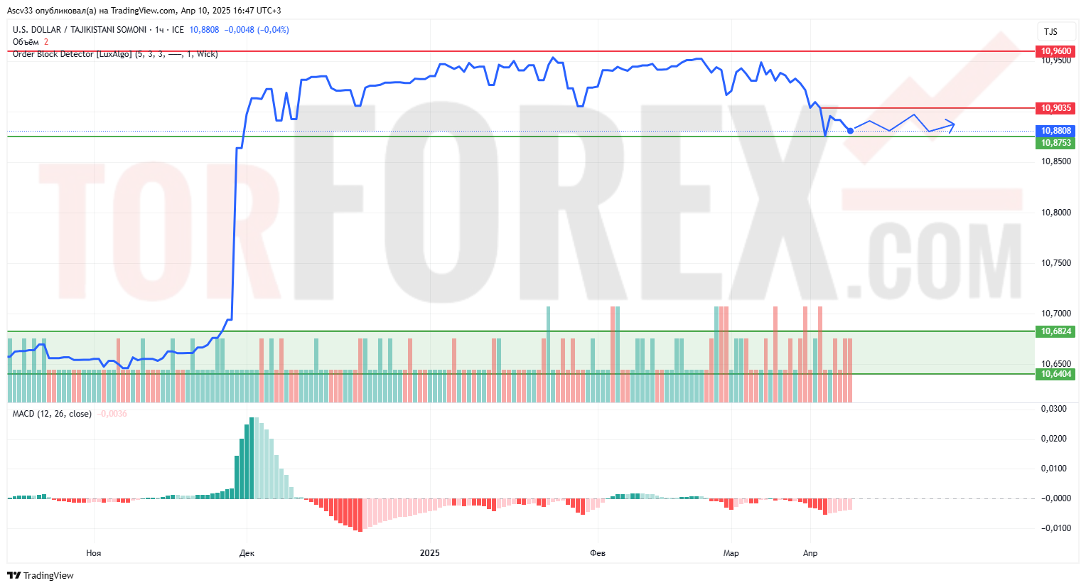 Курс USD/TJS демонстрирует устойчивую консолидацию вблизи уровня 10,88, находясь под давлением с начала марта. Глобально цена удерживается выше ключевой зоны поддержки 10,64–10,68, но без явного тренда вверх.
