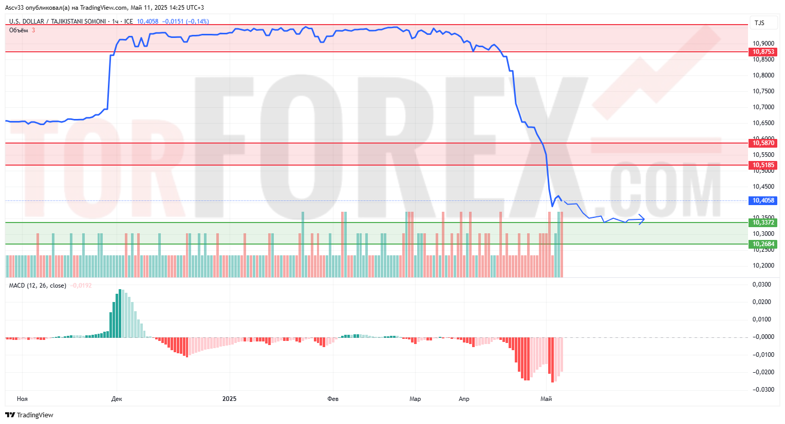 Курс USD/TJS продолжает нисходящее движение, достигнув области поддержки 10,30–10,34 после пробоя долгосрочной консолидации вблизи 10,52. Пара находится под давлением, о чём сигнализирует сохраняющийся нисходящий тренд и слабая динамика MACD. Наблюдается стабилизация вблизи текущих уровней, однако признаков разворота пока не отмечается.
