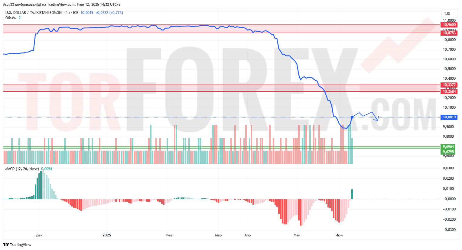 После продолжительного снижения с апреля, пара USD/TJS продемонстрировала отскок от области ниже 9,90 и сейчас тестирует психологически важный уровень 10,00. Пока рост выглядит как техническая коррекция на фоне перепроданности. Общая структура сохраняется в медвежьем тренде, и закрепление выше 10,26 необходимо для смены тенденции.