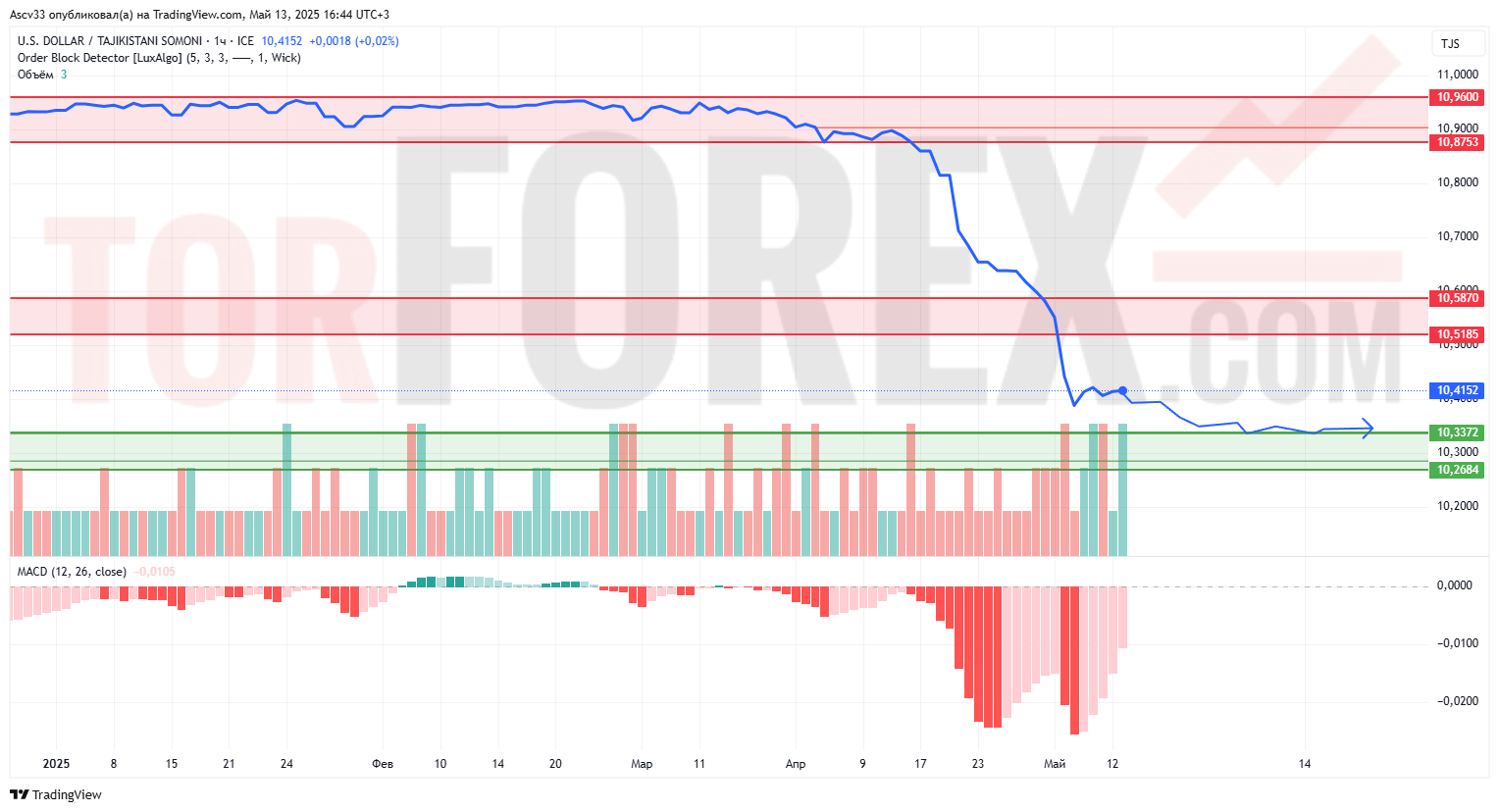 курс usd/tjs продолжает консолидироваться после затяжного снижения, начавшегося в апреле. цена закрепилась ниже уровня сопротивления 10,5185 и торгуется в узком диапазоне между 10,30 и 10,42. макд остаётся в отрицательной зоне, но гистограмма сокращается, что говорит об ослаблении медвежьего импульса.