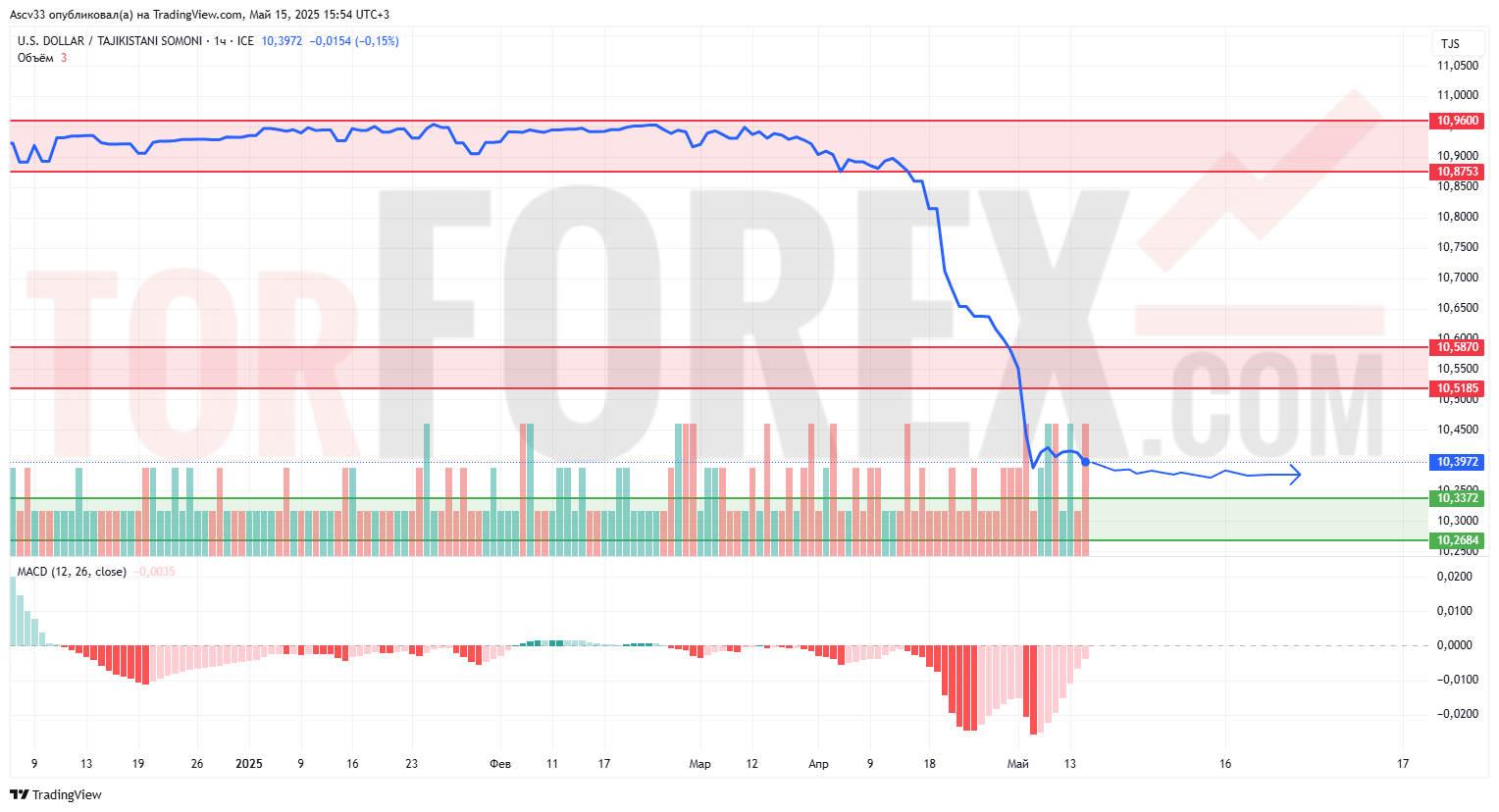 Пара USD/TJS остаётся под давлением после резкого падения с уровня выше 10,80. Цена стабилизировалась в районе 10,39, но признаков разворота вверх пока не наблюдается. Объёмы снижаются, что указывает на отсутствие интереса со стороны покупателей. Индикатор MACD по-прежнему в отрицательной зоне, хотя его нисходящий импульс постепенно ослабевает.