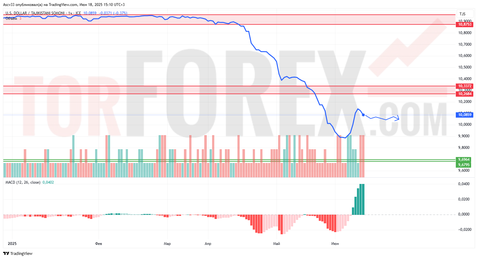 USD/TJS остается под давлением после масштабного снижения в мае. Пара отскочила от области ниже 9,90 и перешла к краткосрочной консолидации в районе 10,08. Несмотря на восстановление, тренд остаётся нисходящим, а импульс ослаблен.