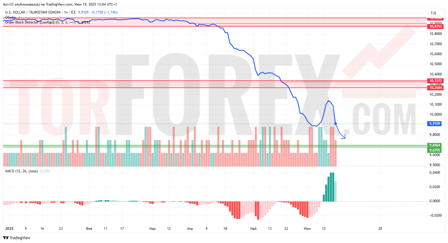 USD/TJS продолжает снижение, формируя устойчивый нисходящий тренд. Цена уверенно пробила зону 10.00 и закрепилась ниже неё. Давление продавцов усилилось, что подтверждается резким снижением объёма на росте и активной красной гистограммой MACD.