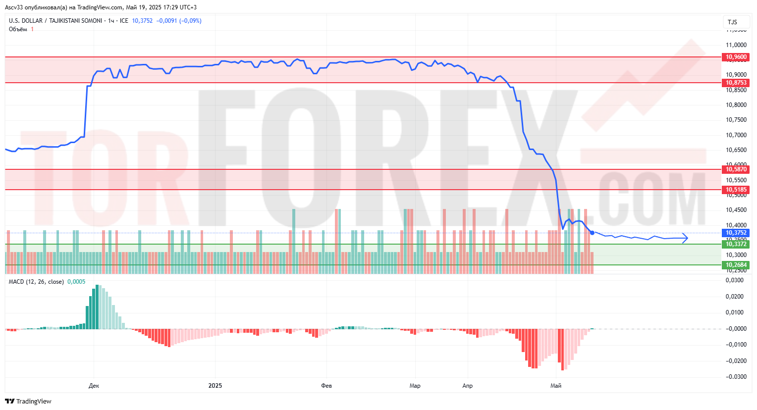 Курс USD/TJS продолжает торговаться в узком диапазоне после резкого падения. Цена стабилизировалась над уровнем поддержки 10,33–10,26, формируя зону консолидации. Попытки восстановления пока сдерживаются уровнем 10,52. Индикатор MACD близок к нулевой линии и демонстрирует признаки замедления нисходящего импульса. Объёмы остаются низкими, что подтверждает отсутствие направленного движения.