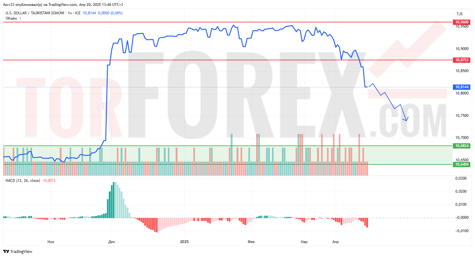Валютная пара USD/TJS продолжает нисходящее движение после пробоя поддержки 10.8753. Снижение происходит устойчивыми темпами, без признаков разворота. MACD находится глубоко в отрицательной зоне, усиливая медвежий настрой. Объёмы остаются стабильными, что подтверждает устойчивость текущего тренда.