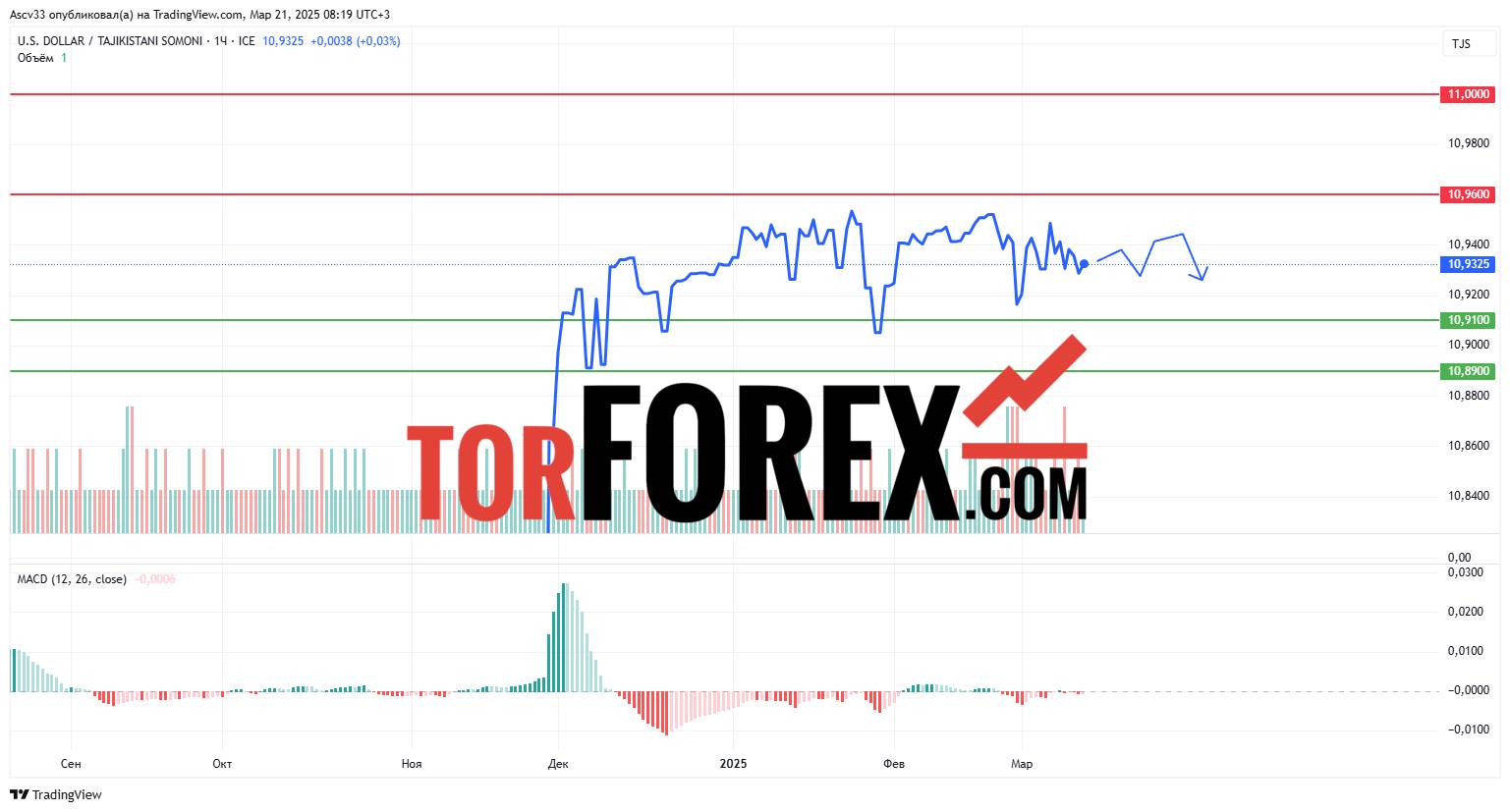 Ожидается, что USD/TJS будет находиться в пределах 10,9100–10,9600 в течение следующих суток. Пробой 10,9600 вверх подтвердит восходящую динамику, тогда как закрепление ниже 10,9100 может усилить давление на снижение. Трейдерам стоит вести внимательное наблюдение за ценовыми колебаниями вблизи этих ключевых уровней, поскольку их прорыв может существенно повлиять на стратегию на рынке.