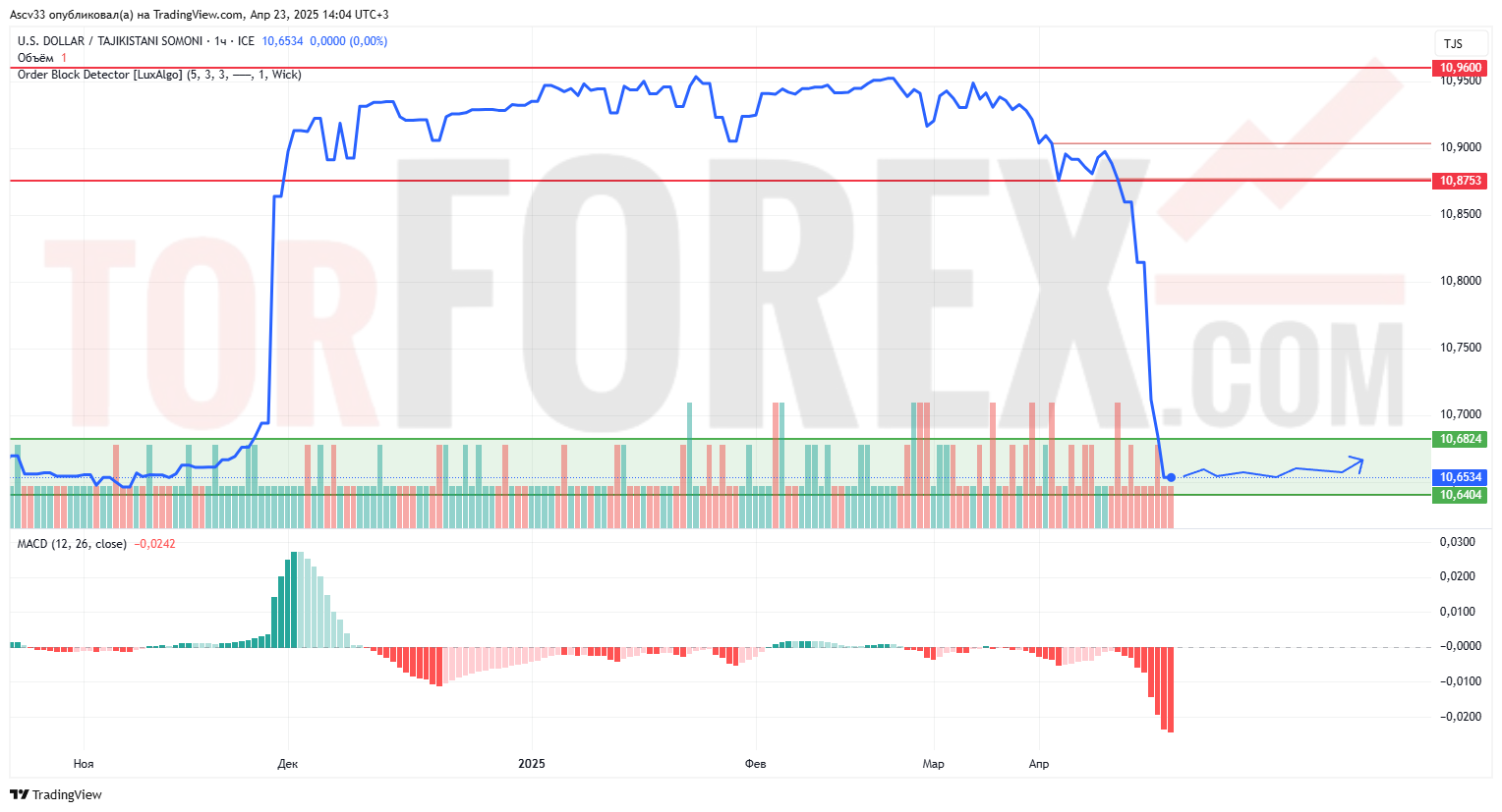 - ниже уровни не сформированы, вероятно движение в зону предыдущего консолидационного диапазона 10.60–10.55 в случае пробоя.