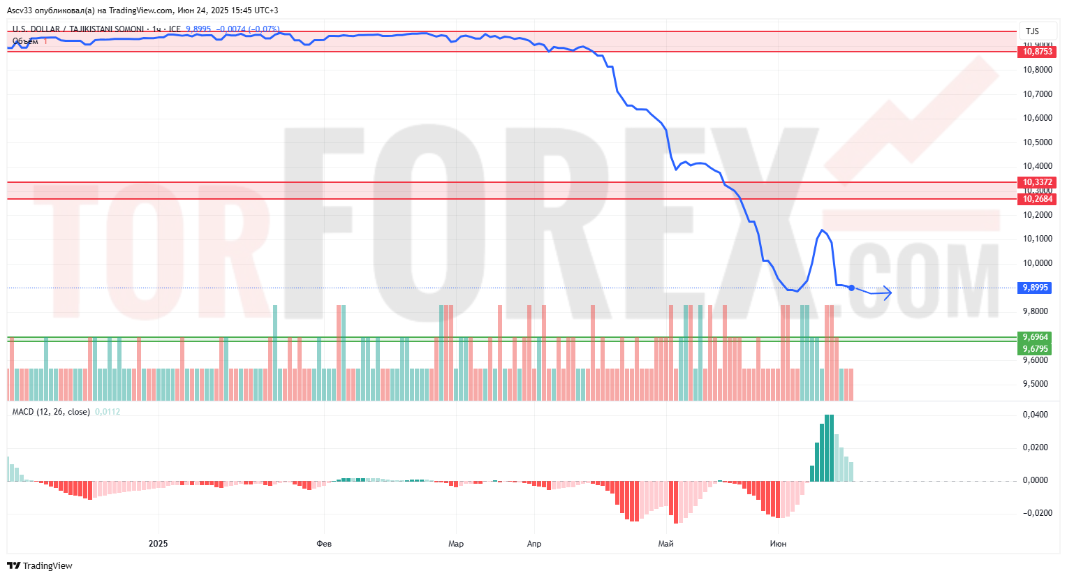 USD/TJS продолжает двигаться в нисходящем тренде, который начался с уровня выше 10,80. С начала июня пара достигла локального минимума ниже 9,80 и демонстрирует признаки стабилизации. Последнее движение сформировало боковой диапазон с замедлением темпов снижения. Индикатор MACD начал коррекционное восстановление после глубокой фазы отрицательной гистограммы, что говорит о возможной консолидации.