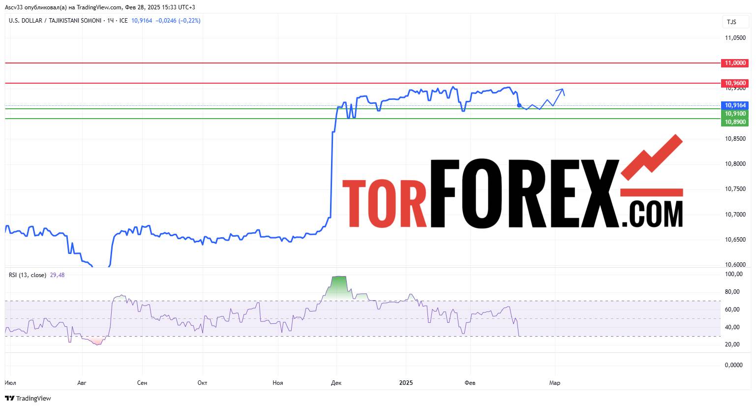 В ближайшие сутки пара USD/TJS, вероятно, продолжит движение в диапазоне 10,9100–10,9600 сомони за доллар США. Трейдерам рекомендуется внимательно следить за реакцией цены на указанные уровни поддержки и сопротивления, поскольку их пробой может указать на дальнейшее направление движения.