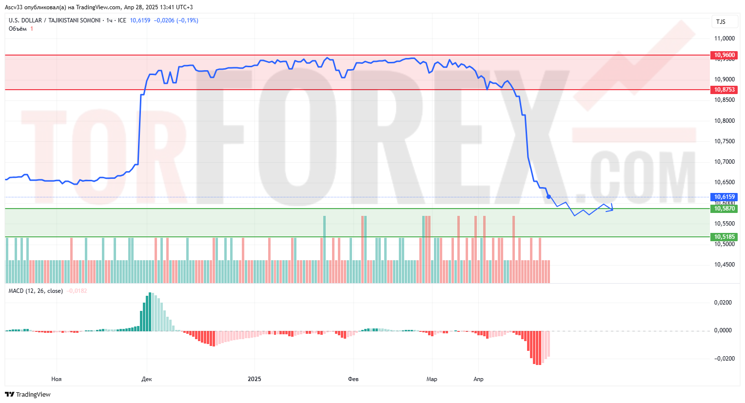 Пара USD/TJS продолжает снижение и торгуется вблизи ключевой зоны поддержки 10,5185–10,5870. Динамика указывает на продолжение медвежьего тренда, при этом на графике наблюдаются попытки консолидации. Индикатор MACD остаётся в отрицательной зоне, что подтверждает наличие нисходящего импульса, но его амплитуда снижается.
