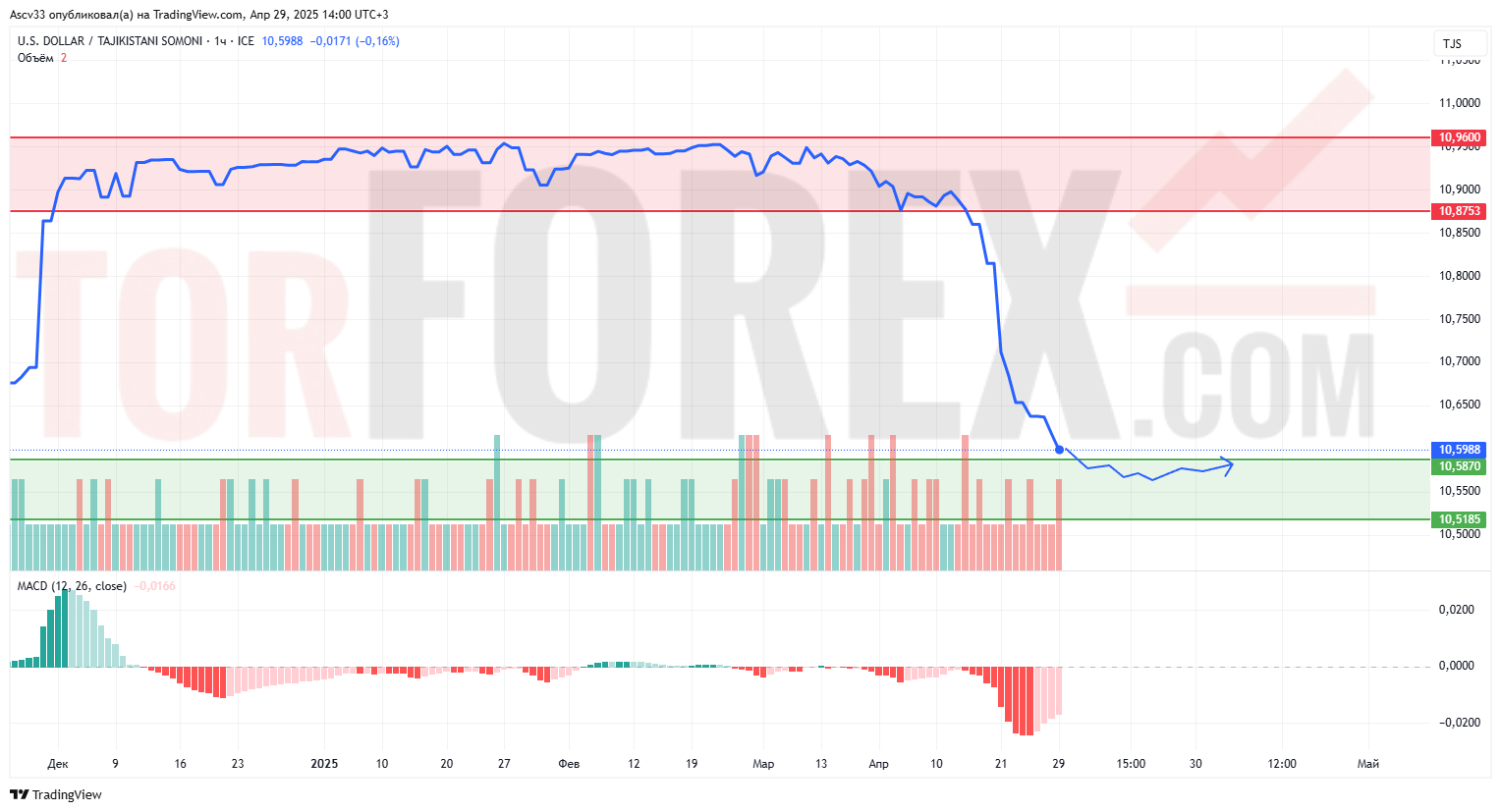 Пара USD/TJS закрепляется ниже зоны 10.6000 после стремительного снижения. Сопротивление на уровне 10.5870–10.6000 сдерживает попытки восстановления. Зона 10.5185 остаётся ключевой поддержкой. Объёмы по-прежнему снижены, что говорит о слабом интересе к активным сделкам. Индикатор MACD остаётся глубоко в отрицательной зоне, но постепенно начинает сужаться, сигнализируя о возможной стабилизации.