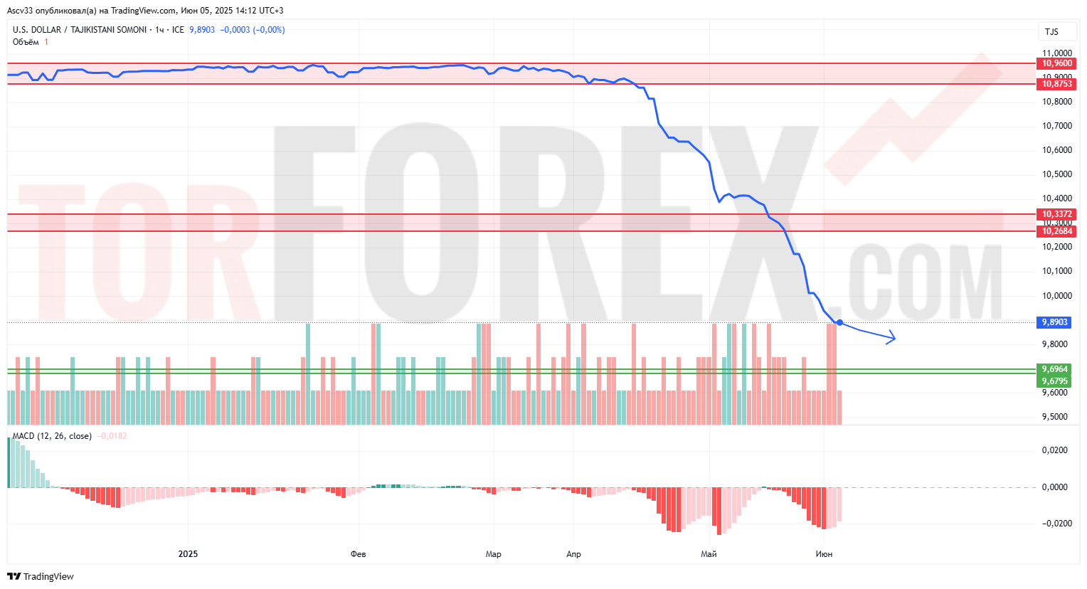 USD/TJS продолжает устойчивое снижение, находясь в мощном нисходящем тренде с конца марта. На графике видно, что цена пробила все значимые уровни поддержки выше 10,00 и закрепилась ниже. Индикатор MACD демонстрирует глубокую отрицательную зону, без признаков дивергенции — медвежий импульс остаётся в силе.