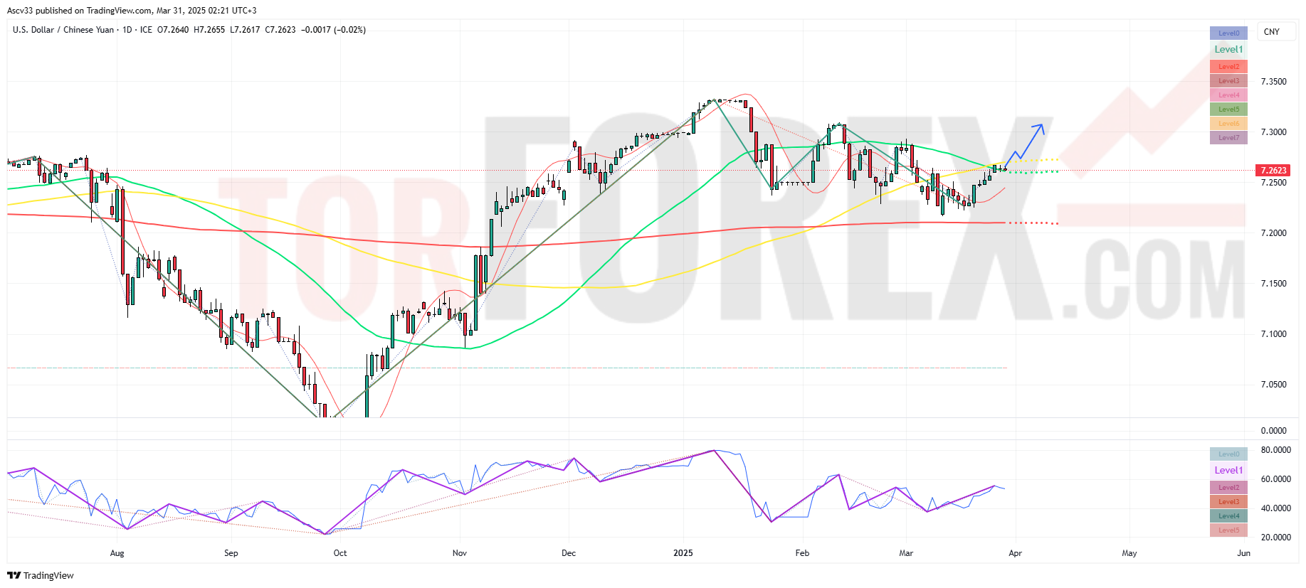 Если паре удастся закрепиться выше 7.28, откроется путь к следующему сопротивлению в районе 7.32–7.34. Это станет подтверждением возобновления восходящей тенденции.