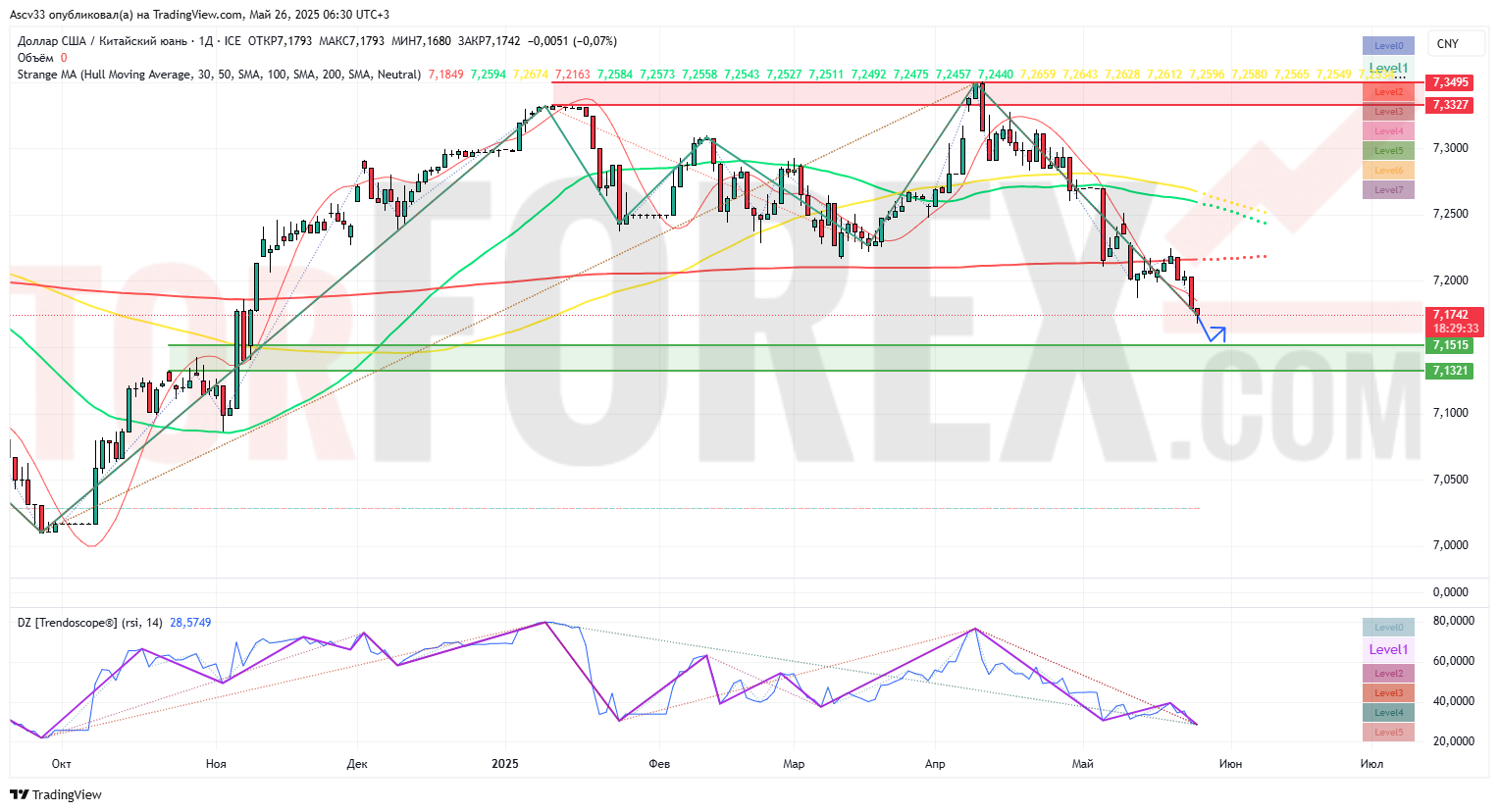 Медвежий сценарий (продолжение снижения): Если текущее давление продавцов сохранится, и цена не сможет преодолеть ближайшие сопротивления, вероятен пробой вниз ближайшей поддержки 7.1324 – 7.1515 CNY. В таком случае, следующей значимой целью для медведей станет область 7.1000 – 7.1100 CNY и далее 7.0500 – 7.0700 CNY. Устойчивое закрепление ниже 7.1324 CNY будет сильным подтверждением продолжения нисходящего тренда. Усиление медвежьего импульса будет подтверждено дальнейшим падением индикатора и пробоем ключевых поддержек.