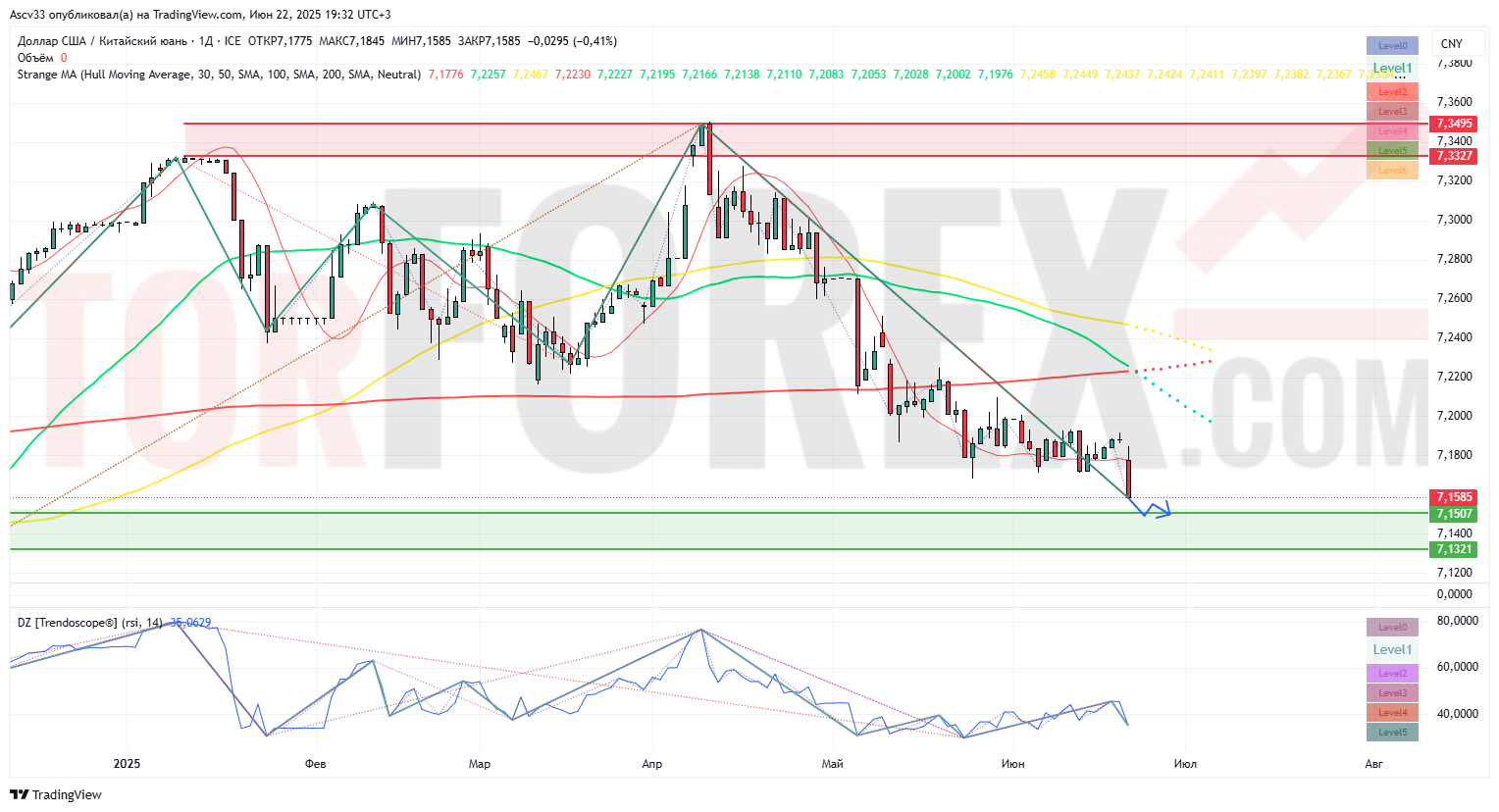 Основной сценарий на 23–29 июня — продолжение снижения к 7,15 и тест 7,13. При этом возможны слабые отскоки внутри диапазона, но пока нет признаков разворота тренда.