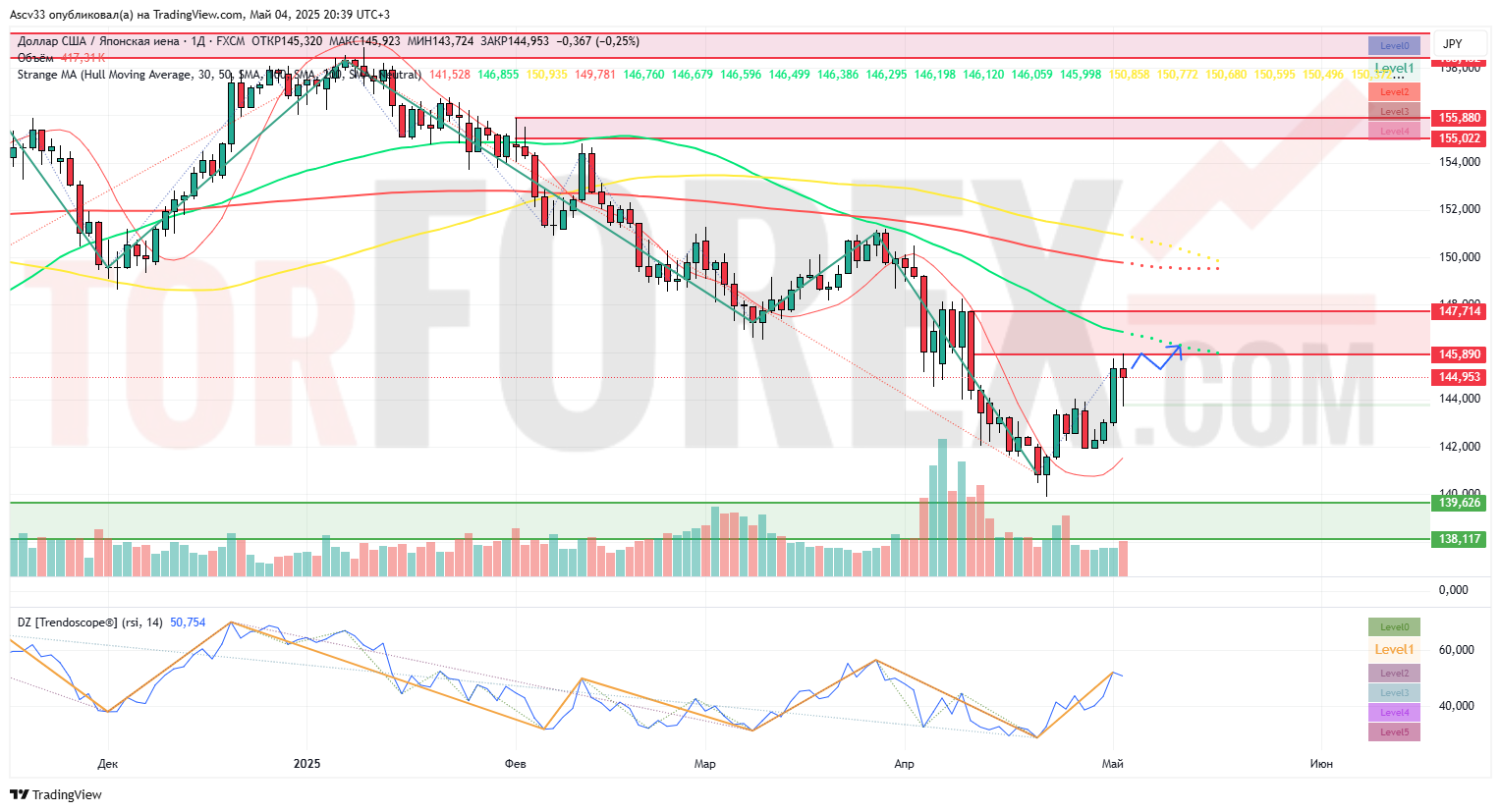Курс USD/JPY завершает неделю на отметке 144,95, демонстрируя восстановление после апрельского снижения. Однако восходящее движение пока ограничено мощным сопротивлением в районе 145,90–147,70, а общая структура рынка остаётся под давлением долгосрочного нисходящего тренда.