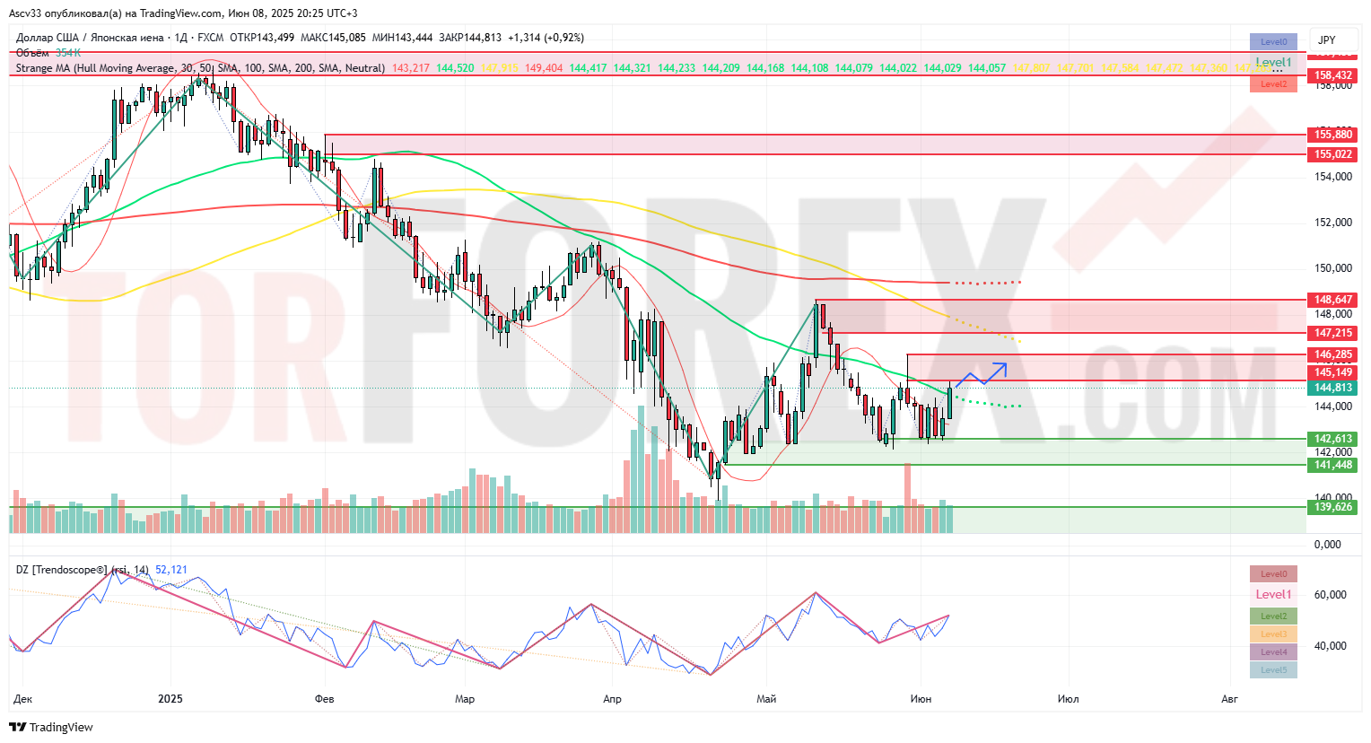 USD/JPY пытается сменить краткосрочный вектор на фоне отскока от ключевой поддержки. Однако зона предложения в районе 145,50–146,30 остаётся критичной. Без фундаментального драйвера прорыв маловероятен.