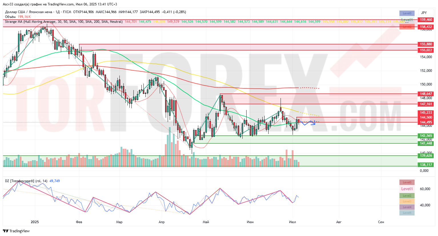 Торговая идея: в случае пробоя 144,00 рассматривать короткие позиции с целями 142,00 и 139,60. Альтернативный сценарий — вход в лонг при закреплении выше 145,50 с целями 147,15–148,65.