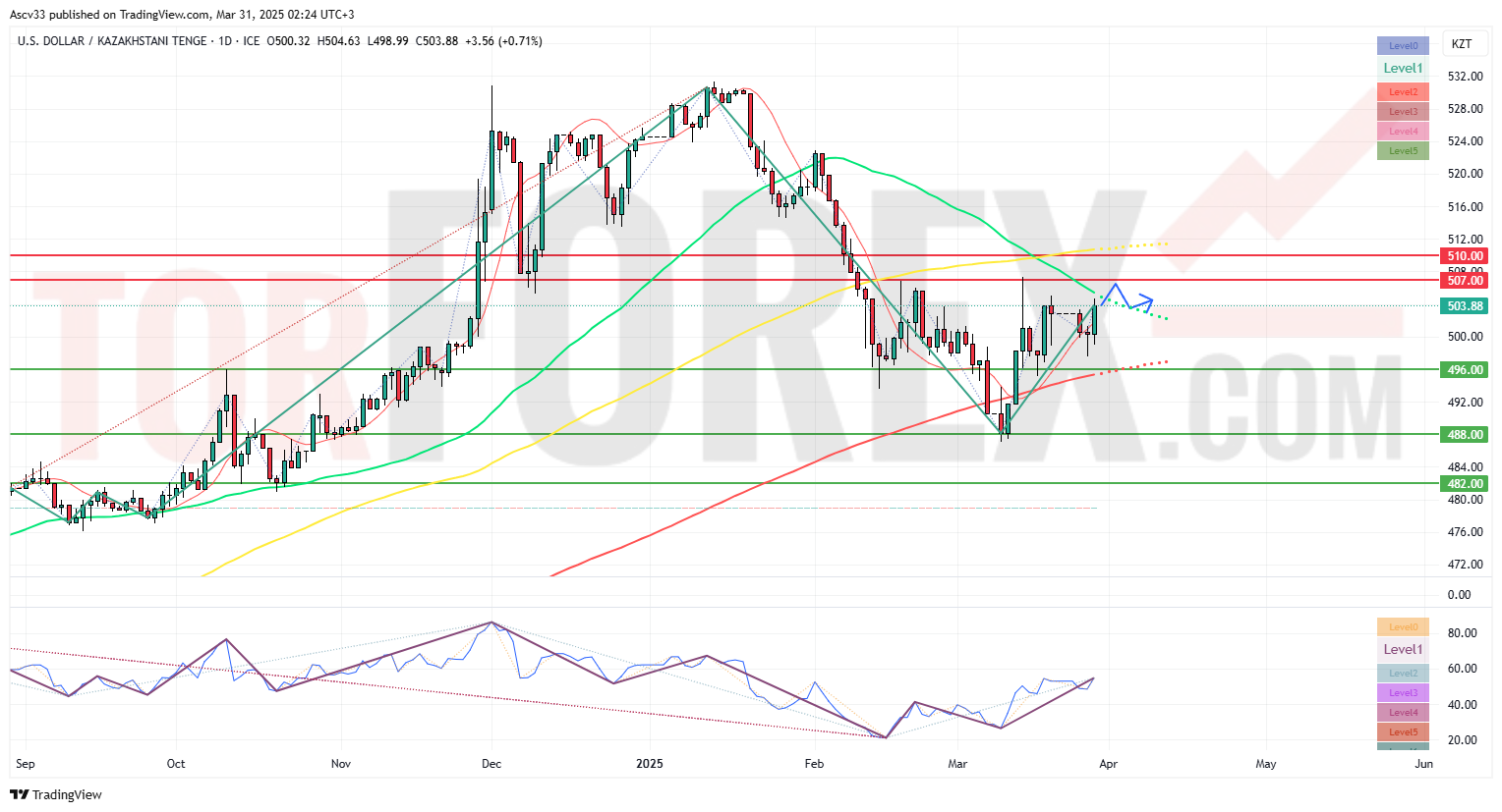 Курс USD/KZT продолжает торговаться в границах бокового канала, демонстрируя признаки консолидации после активной фазы снижения в феврале. Попытка роста от уровня 488 была сдержана зоной сопротивления в районе 507–510, где проходит кластер скользящих средних и исторические уровни. На текущий момент пара удерживается выше психологической отметки 500, но признаки неопределённости усиливаются.