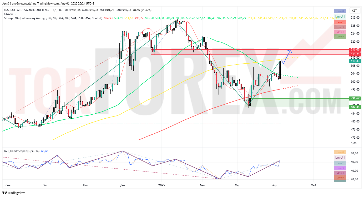 Пара USD/KZT демонстрирует уверенный рост с пробоем локального сопротивления и усилением импульса. Техническая картина поддерживает продолжение восходящего движения в направлении 516.00, однако зона 512.00 остаётся ключевой для ближайшего сопротивления. RSI пока не сигнализирует о перегретости, что оставляет потенциал для продолжения тренда.