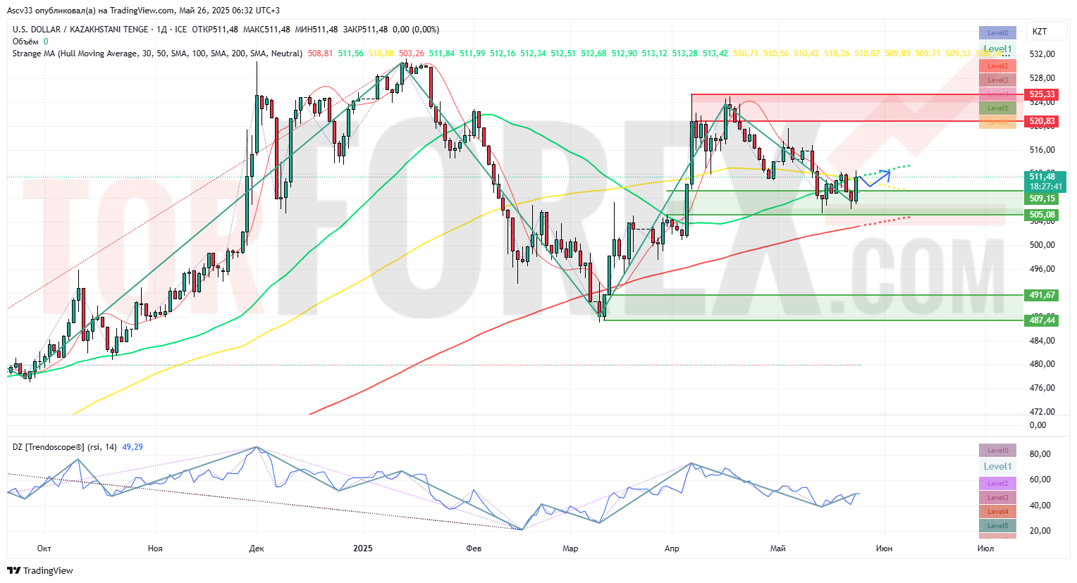 Исходя из текущего анализа графика и текущей цены 511.48 KZT, можно выделить два основных сценария развития событий для торговой пары USD/KZT на предстоящей неделе: