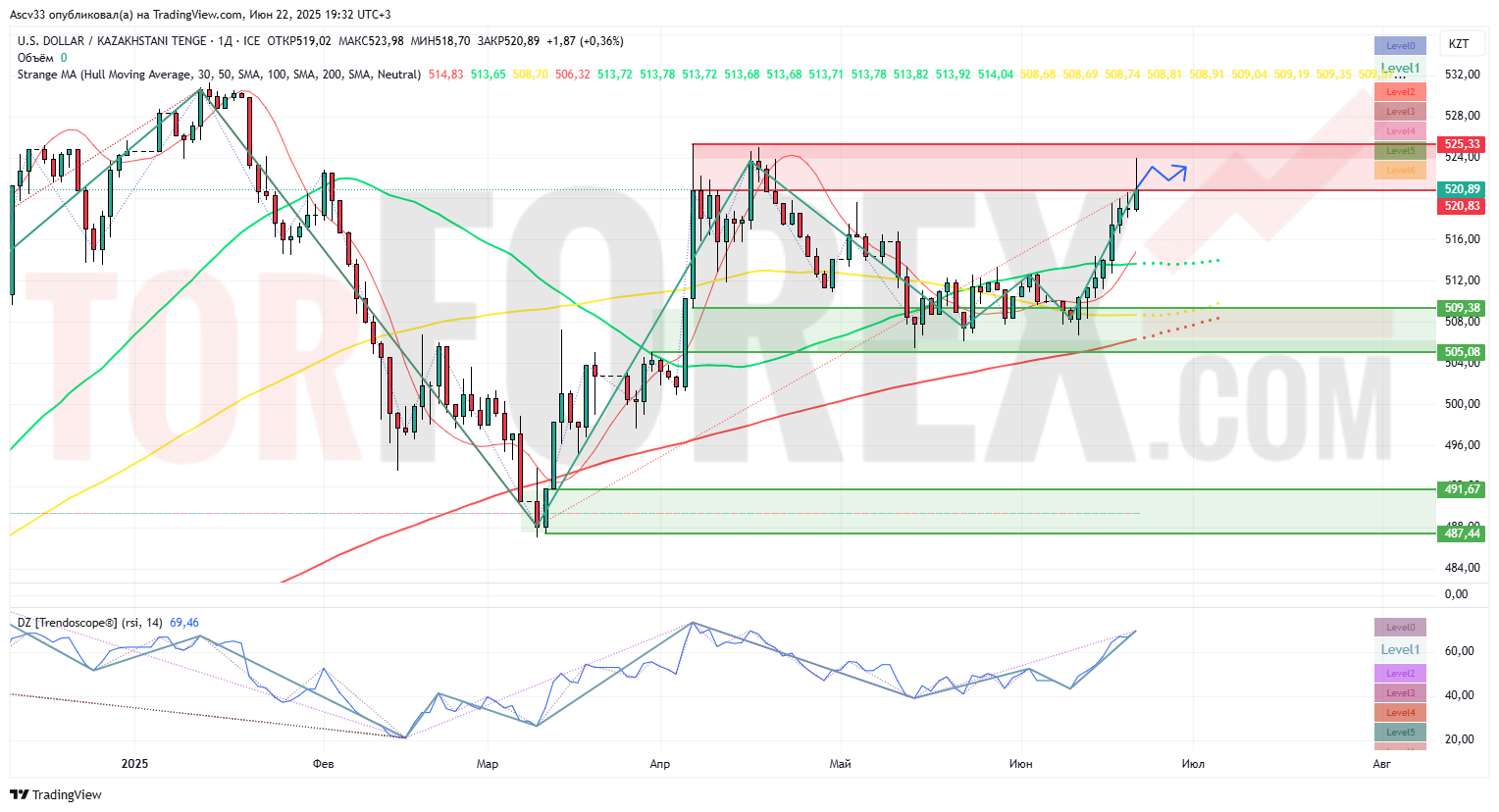Основной сценарий на неделю 23–29 июня — попытка закрепления в диапазоне 520–525 и ретест сопротивления 525. После чего возможна краткосрочная коррекция к 514–509 для набора ликвидности.