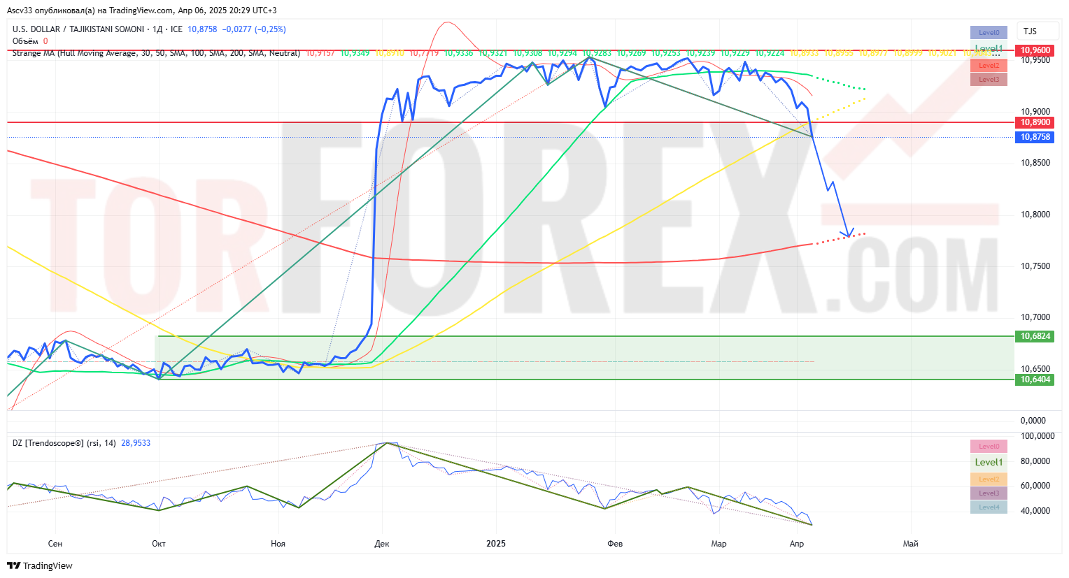После длительного периода боковой динамики в районе 10.92–10.93, курс USD/TJS демонстрирует пробой поддержки вниз и закрытие на уровне 10.8758. Это может свидетельствовать о начале нисходящей коррекции, особенно на фоне ослабления RSI и выхода цены ниже EMA 50.