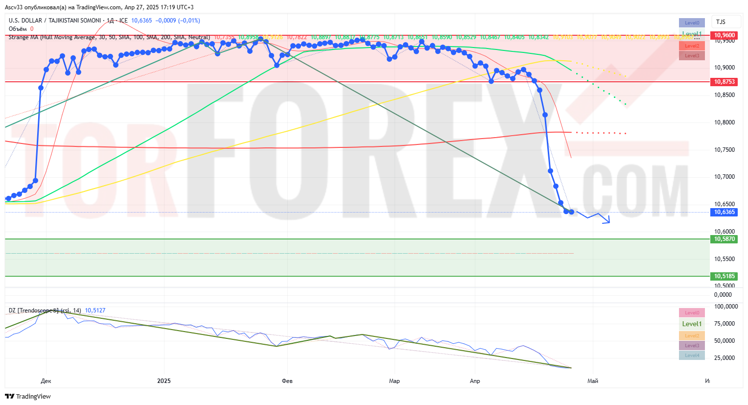 Пара USD/TJS сохраняет уверенный нисходящий тренд. Основная торговая идея — продажи на откатах или при пробое новых минимумов.
