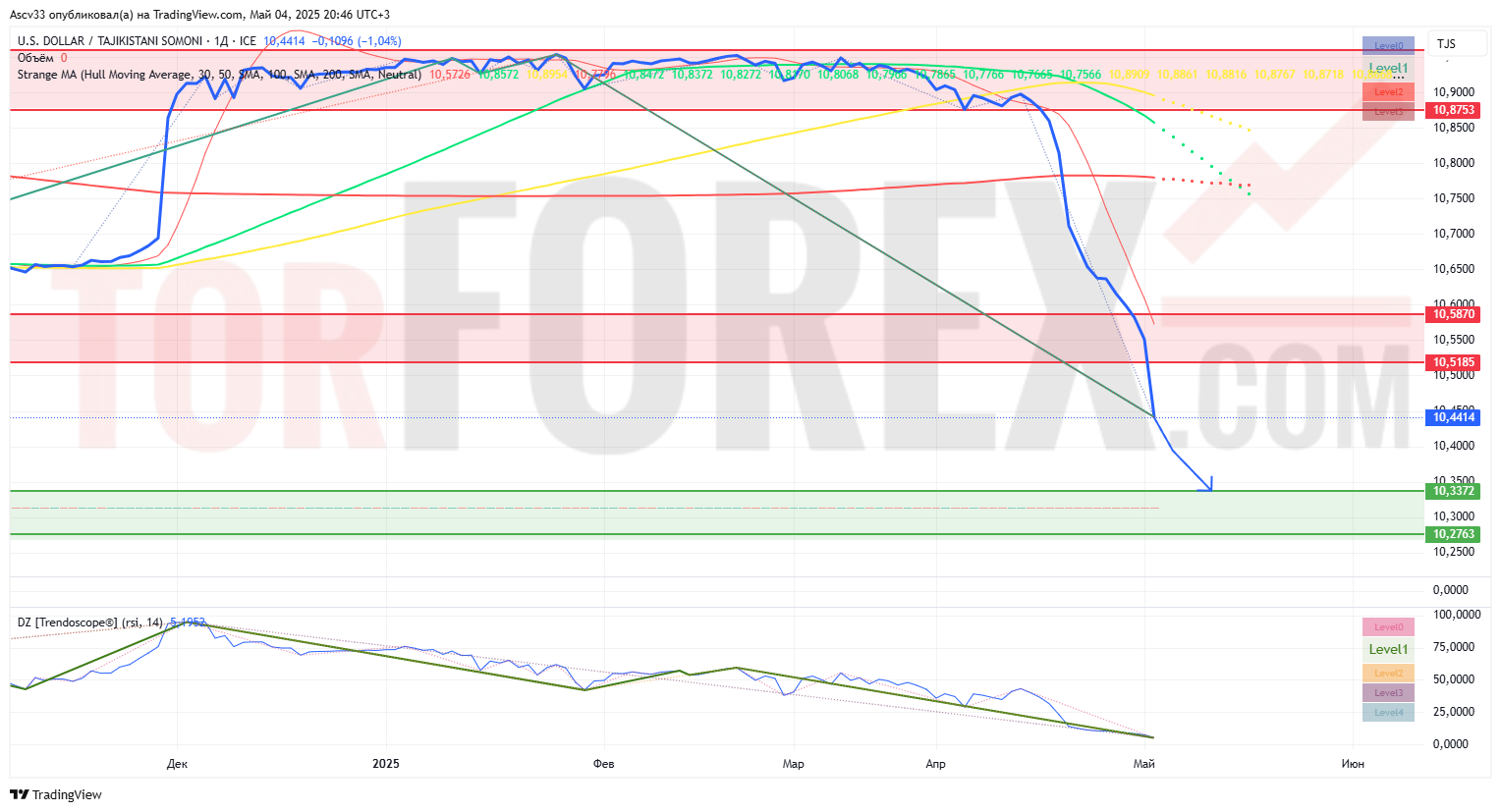Пара USD/TJS торгуется на уровне 10,4414, продолжая устойчивое снижение. Цена пробила ключевые уровни поддержки, и техническая картина указывает на возможность дальнейшего ослабления доллара к сомони.